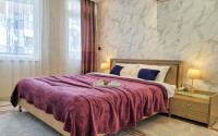 Апартаменты имеют 2 этажа. На первом этаже расположены 2 спальни позволяющие разместиться 4 гостям, 2 санузла и кухня-гостиная с выходом на большой балкон с садовой мебелью. Одна из спален также имеет выход на балкон.