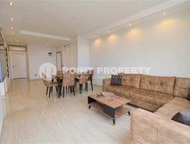 The 2+1 layout with a total area of 105 m² includes a bright living room with an open-plan kitchen equipped with a set, a dining area and upholstered furniture for relaxation. The apartment has two bedrooms: one has twin beds and a wardrobe, the second has a large double bed and a spacious wardrobe. The floor is made of porcelain stoneware, the walls are decorated in a combination of paint and wallpaper.