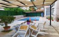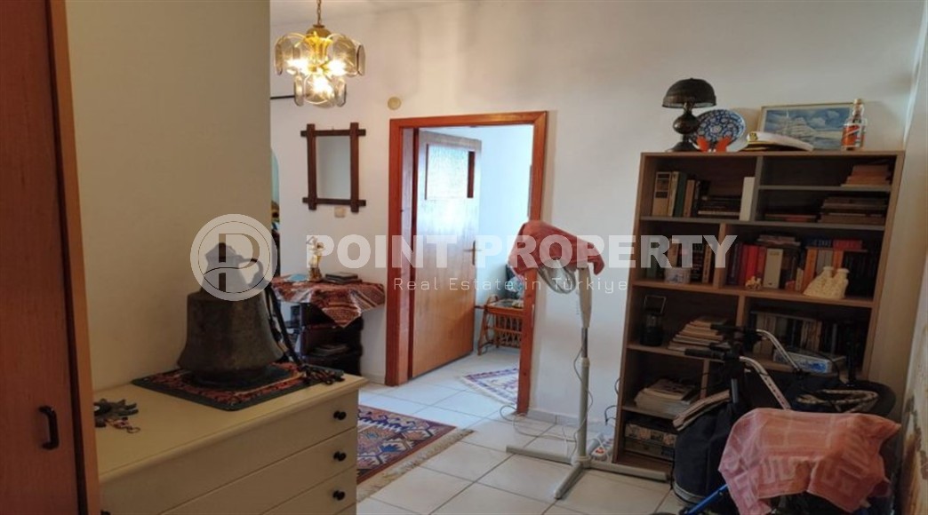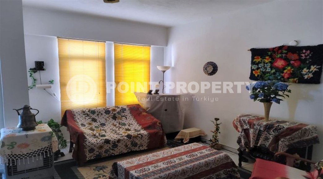 One of these budget apartments is presented in this section. It is located on the 4th floor in a house built in 2009, in the very center of the area, and a two-minute walk from the beach. The total area of the apartment is 100 m2, the layout includes a living room combined with a kitchen, two bedrooms, a bathroom and two glazed balconies overlooking the city streets and the green slopes of the Taurus Mountains. The design of the rooms is simple and versatile, with warm light shades in the interior, which are successfully complemented by bright paintings and decorative items. The living room is equipped with a sofa, armchair, coffee table, chest of drawers and dining table, the kitchen is equipped with a compact refrigerator. One of the bedrooms has comfortable beds, and the second has a study area with comfortable sofas and a desk. At the entrance there is a large bookcase with open shelves, and on the balconies there is practical garden furniture.