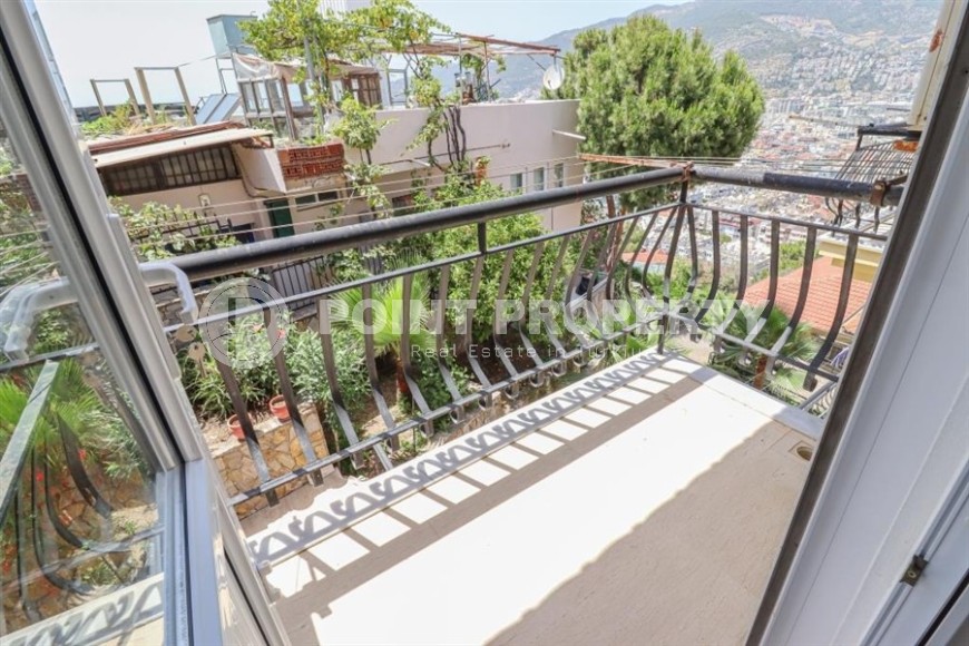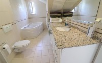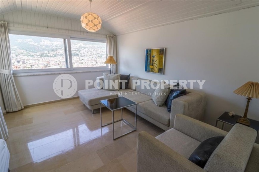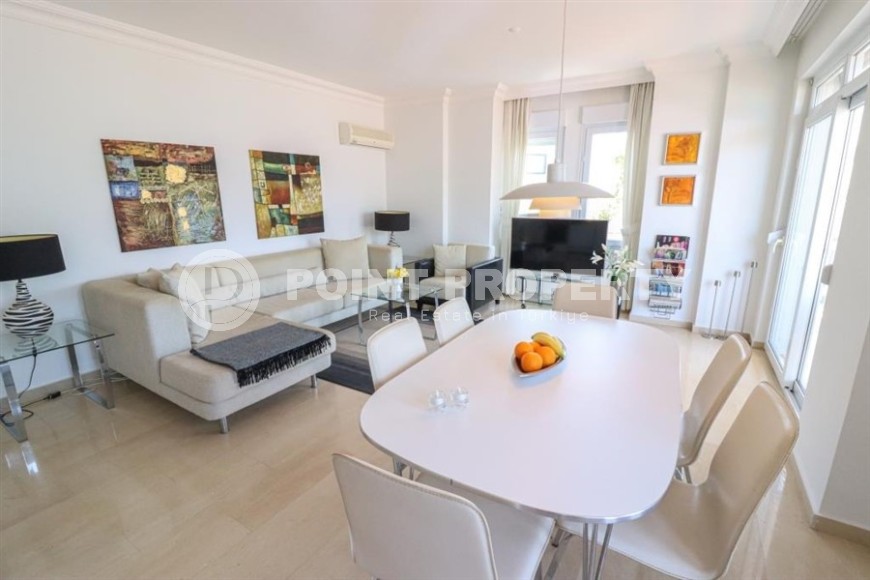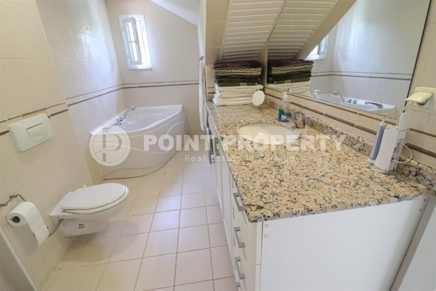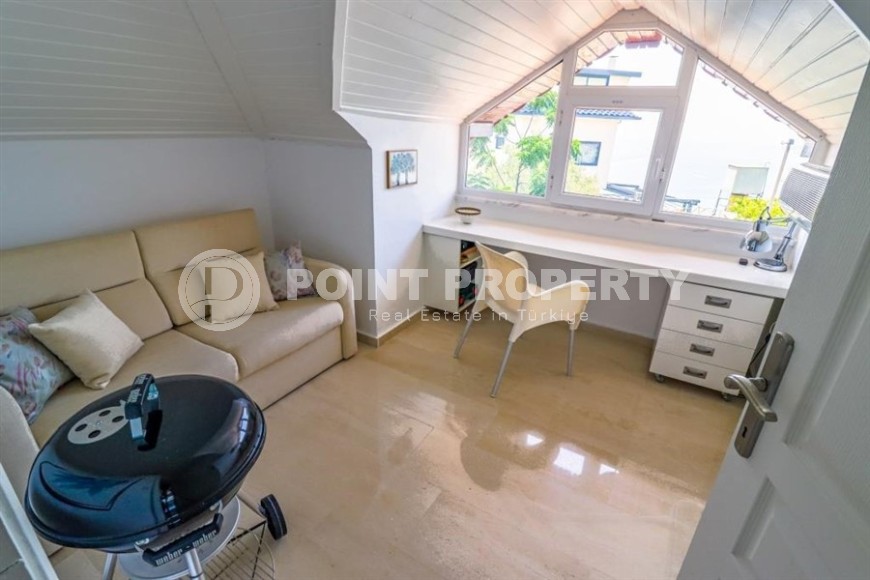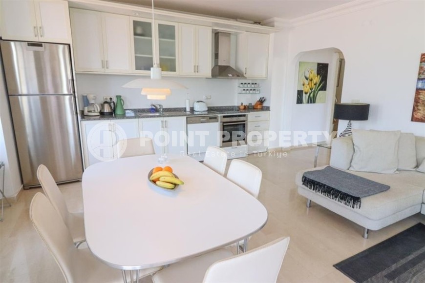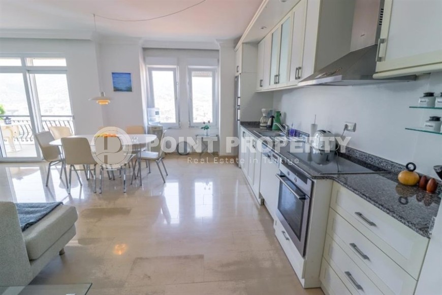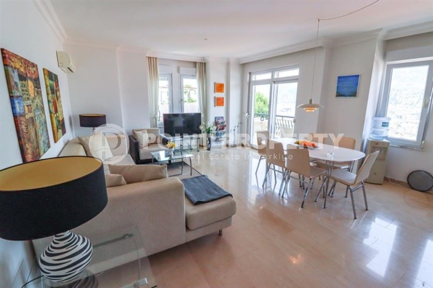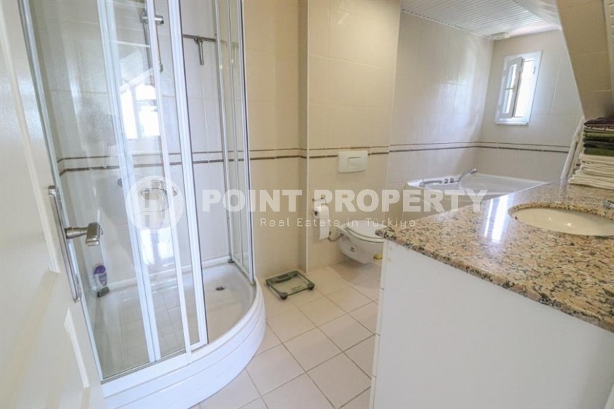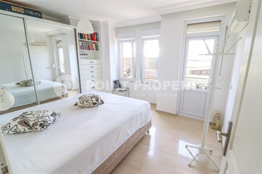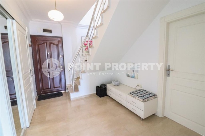In the heart of the picturesque Mediterranean resort of Alanya, in the historical district of the city - Calais, a comfortable apartment is for sale, which is ideal for a summer residence. It is located on the 2nd floor with an attic in a residence built in 2005 and has a total area of 125 m2. The 3+1 planning solution is represented by an American kitchen, a living room, three bedrooms, three bathrooms equipped with showers and a bathtub, two open balconies and a panoramic terrace with a magnificent view of the sea and the ancient fortress. The apartment is bright and atmospheric - the white color in the interior creates a feeling of lightness and cleanliness, and bright modern paintings add gloss and individuality. The living room is located on the 1st floor and is equipped with a soft corner sofa, an armchair, a coffee table, a side table and a dining table. The practical kitchen is equipped with a refrigerator, dishwasher, touch surface and oven. One of the bedrooms has a comfortable bed and spacious wardrobes, the second has a relaxation room with a sitting area, and the third bedroom is a study with a desk and a massive sofa. The balconies and terraces are equipped with recreational spaces with sun loungers and compact garden furniture.