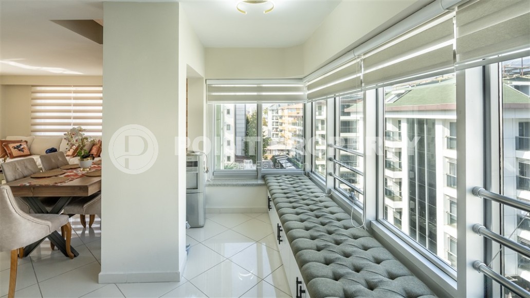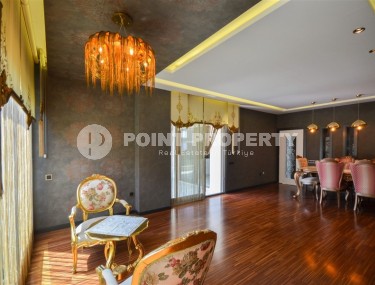 This section presents an apartment with a luxurious location almost on the seashore, in the center of the popular resort area of Alanya - Lower Oba. This part of the city is developed and modern, and is perfect for both summer holidays and permanent residence. The apartment is located on the 4th floor with an attic and has a total area of 240 m2. The 4+1 layout consists of an open kitchen, living room, four bedrooms, two bathrooms, two balconies and a spacious terrace overlooking the residence’s courtyard and the sea. The design of the apartments is modern and laconic, with warm light shades and wood elements in the interior. The living room is successfully divided into two functional areas - a living room, with a soft sofa, an armchair, poufs, a coffee table and a side table; and a stylish kitchen with dining table, equipped with the latest technology. Additional recreational space is organized by the window - practical soft seats with sections for storing things. Three bedrooms are equipped with comfortable beds and modern furniture, and one of the rooms has a sofa, coffee table and nightstand. The balconies and terraces under the awning are equipped with cozy seating areas with wicker garden furniture.