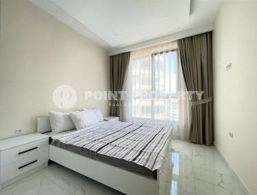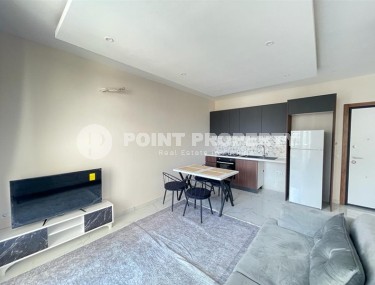 This 1+1 apartment with a total area of 55 m² is located on the second floor of a building built in 2005. The layout includes an entrance hall with a cabinet and mirror, a spacious living room with an American-style kitchen, which features a corner set with appliances and a washing machine. This area also includes a separate relaxation area and a dining corner. A separate bedroom offers comfortable space for sleeping and storage. The apartment has one equipped bathroom and two balconies with pleasant views of the surrounding area and the complex. The flooring is porcelain stoneware, and air conditioning is installed. The property is fully furnished and ready for occupancy.