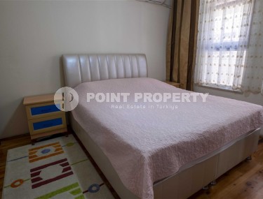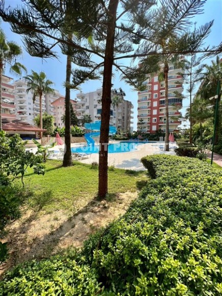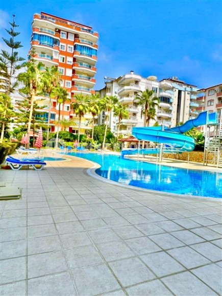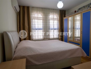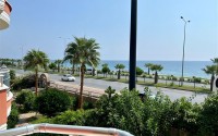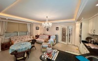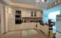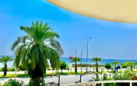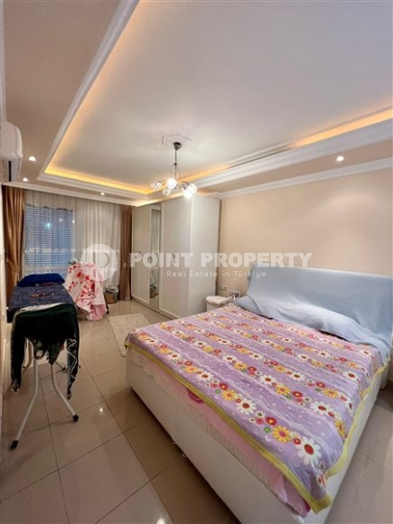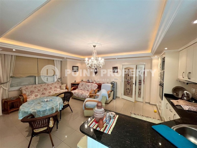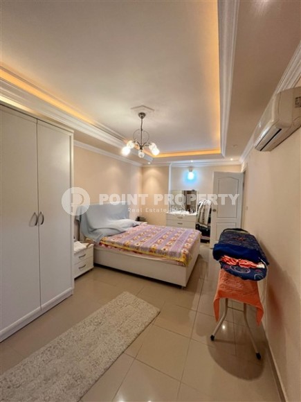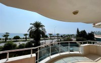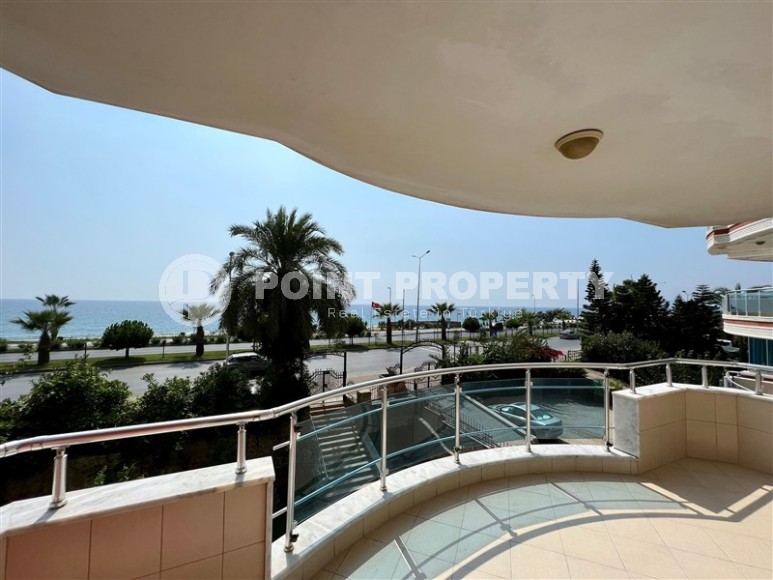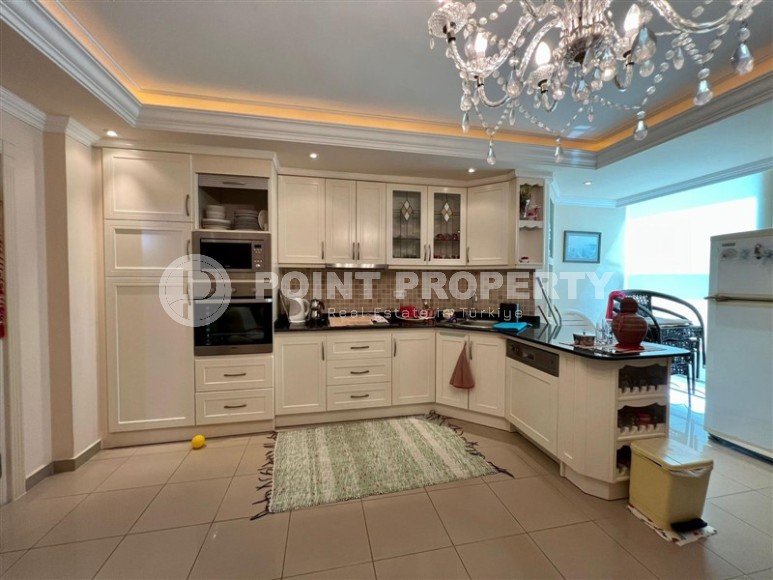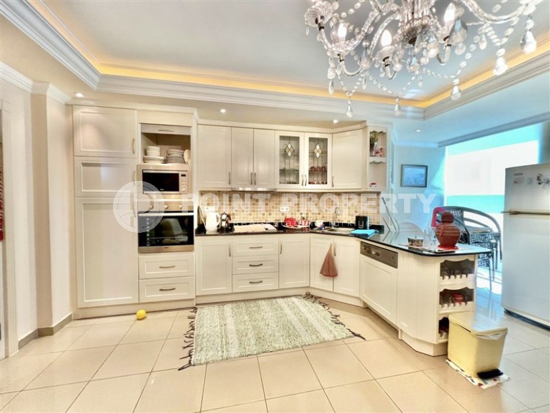 The modern district of Alanya - Mahmutlar - is one of the most developed in the city. Chain supermarkets, shopping and entertainment complexes, restaurants for every taste, spas, beauty salons, children's educational institutions, private and public clinics - there is absolutely everything for a comfortable life all year round and for quick adaptation. And the favorable location of the area along the coast makes it easy to combine an active social life with a comfortable beach holiday. In the very center of this landscaped area, on the first line from the sea, a spacious apartment is for sale, which can become either your summer residence or an apartment for permanent residence. The layout of the apartment, with a total area of 130 m2, includes an open kitchen combined with a living room, two bedrooms, two bathrooms equipped with showers and two open balconies overlooking the sea and the embankment. The design of the rooms is restrained and laconic, with warm pastel shades in the interior and soft multi-level lighting. The living room, with a massive crystal chandelier, is equipped with soft armchairs, a sofa, a coffee table and a nightstand. There is also a dining table with wicker chairs that can be used for the balcony. A spacious kitchen corner, with a lot of spacious sections for storing food, is equipped with a built-in refrigerator, dishwasher and oven. The bedrooms have comfortable beds, bedside tables, a dressing table and a wardrobe, and at the entrance there are additional wardrobes for shoes and outerwear.