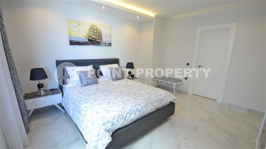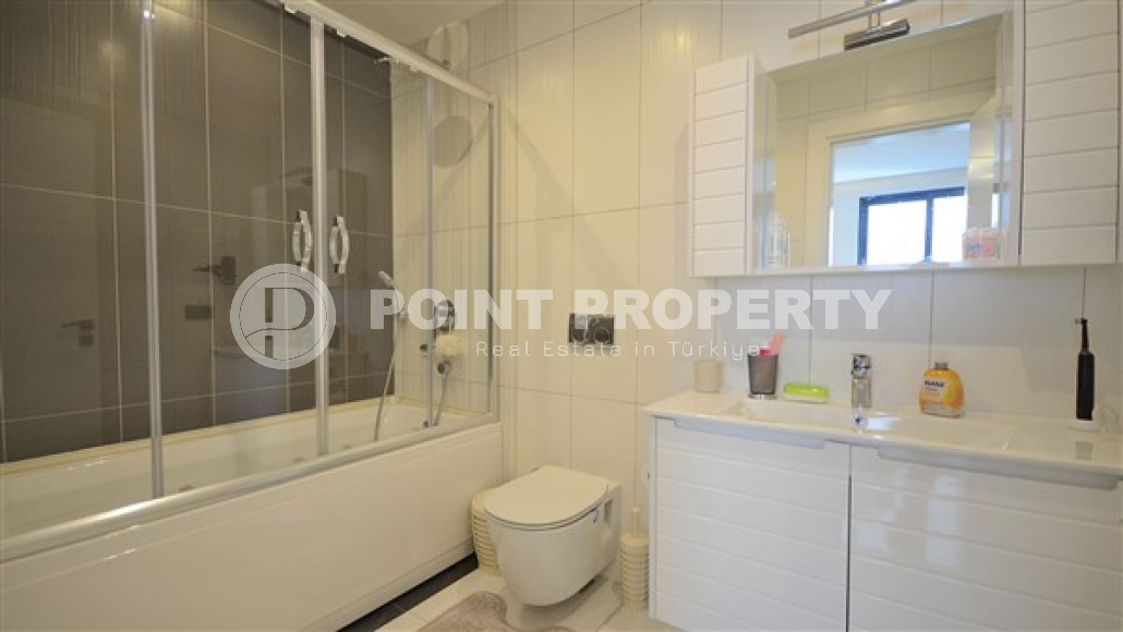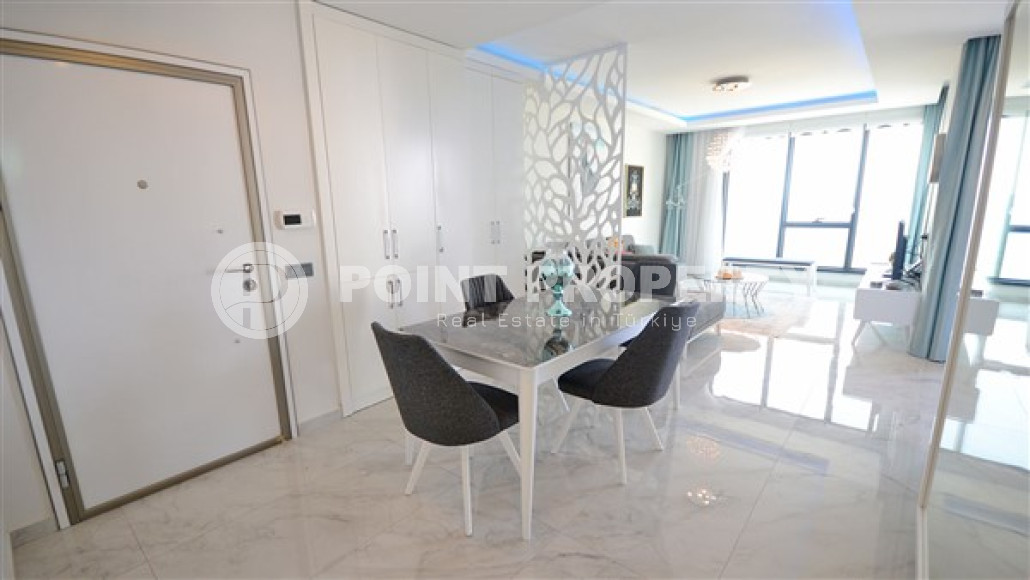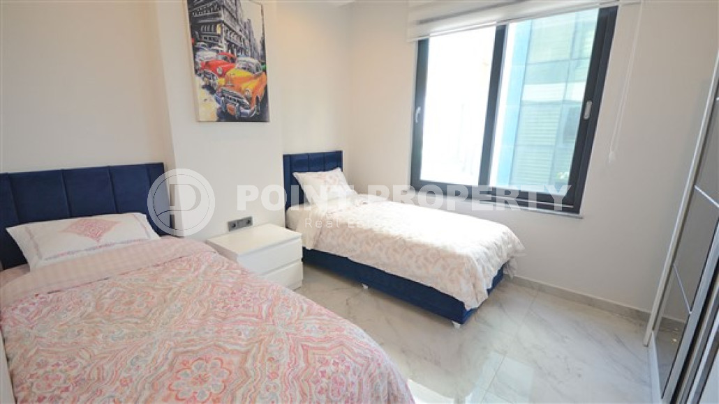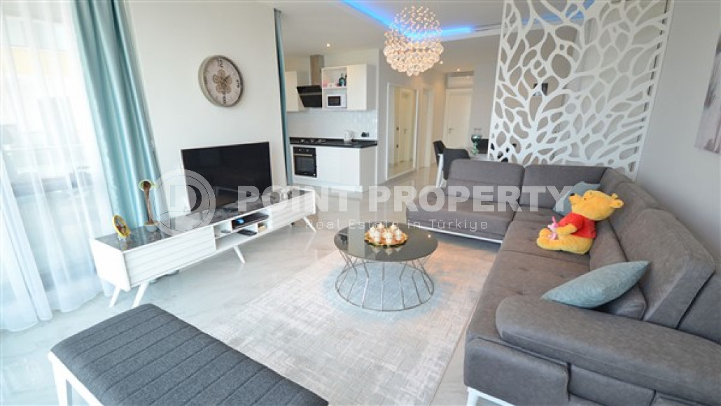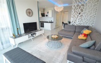 Incredibly bright, light, atmospheric apartment is located on the very shore of the Mediterranean Sea, and its modern design absolutely corresponds to the idea of a comfortable summer residence. Apartments 2+1 with a total area of 110 m2 have a living room combined with a kitchen, two bedrooms, two bathrooms and two balconies. Thanks to successful design solutions and space zoning, the apartment seems more spacious and comfortable, and light colors in the design give it the lightness and charm of a seaside resort. Stylish furniture and new household appliances, modern design and fashionable decorative elements turn the apartments into a rest and relaxation area, and balconies overlooking the sea will certainly become your favorite corner in the apartment.