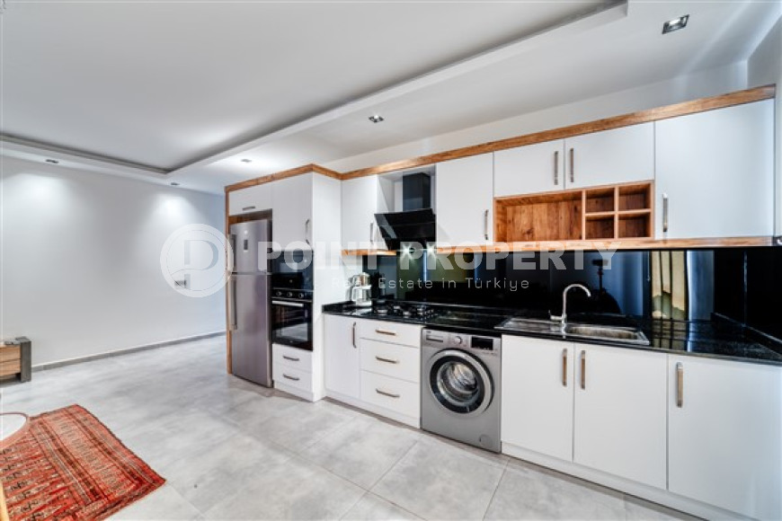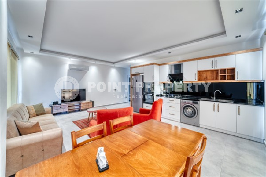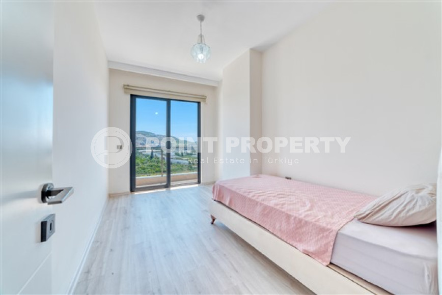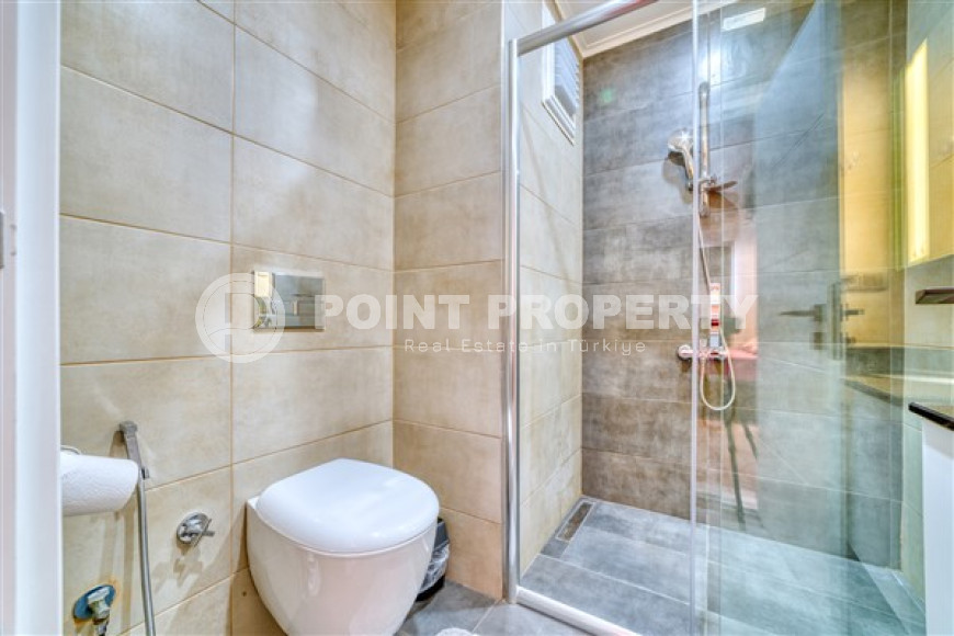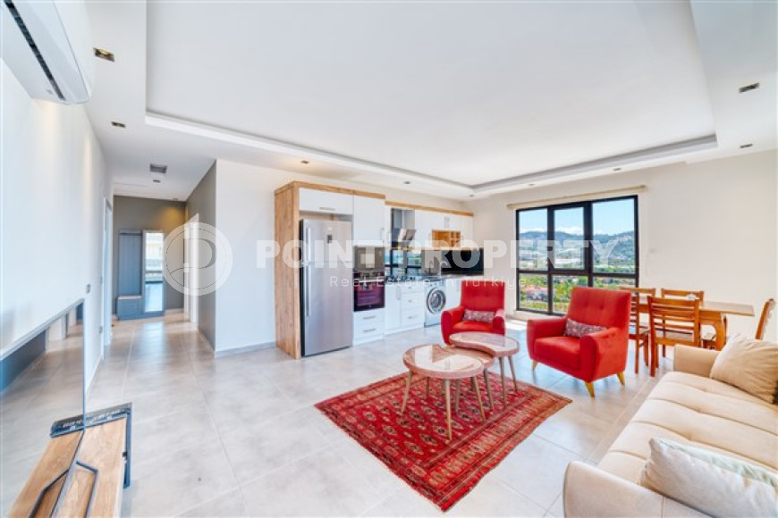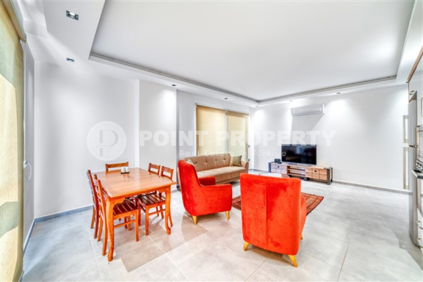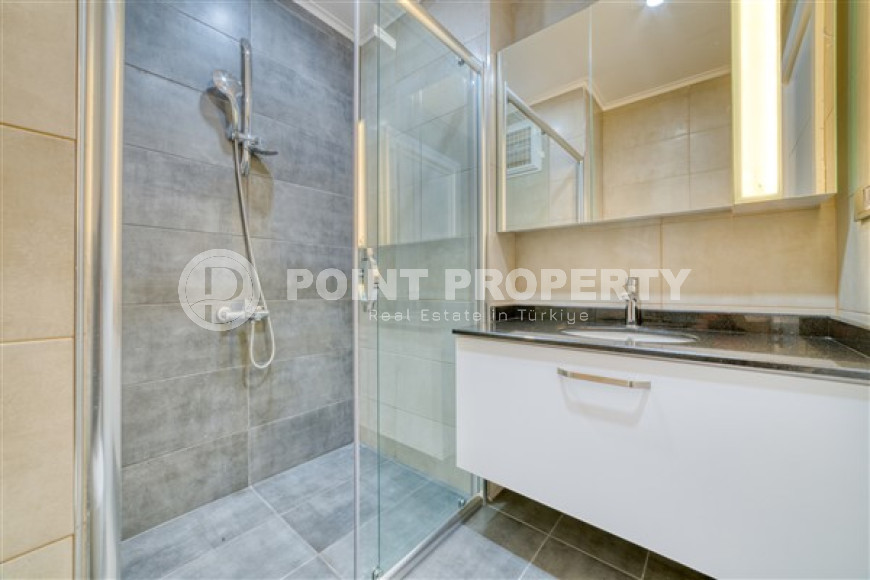 The stereotype that life in resort towns is boring and monotonous has long been a thing of the past, proof of this is the modern developed area of Alanya - Mahmutlar with residential complexes, the internal infrastructure of which is in no way inferior luxury hotels. In one of these residences, commissioned in 2021, a spacious 2+1 apartment with a living room combined with a kitchen, two bedrooms, two bathrooms and two panoramic balconies overlooking the city, mountains and sea is for sale. The total area of the apartments is 105 m2, and they are offered with furniture and household appliances. The salon already has a comfortable sofa and armchairs and a large dining table, the bedrooms have comfortable soft beds and a spacious wardrobe, the bathrooms have modern showers and high-quality ceramics, and the spacious kitchenette is equipped with a refrigerator, washing machine and oven. The light, laconic design of the apartments, with a combination of warm shades in the interior, will certainly appeal to many, and if the new owners want to give the apartment their own style and individuality, this will not be difficult to do, just by adding minor decorative items.