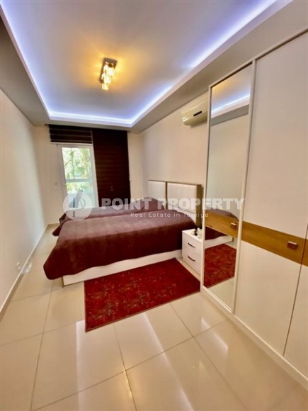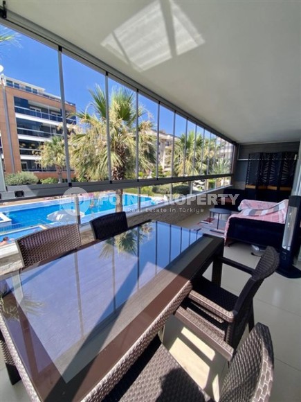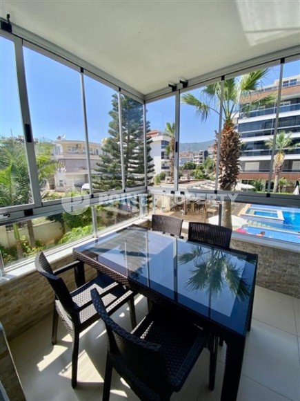 In this section we present to your attention an apartment that is perfect for both summer holidays and permanent residence. It is located in the center of the European region of Alanya - Lower Oba, which is famous for its well-groomed streets, landscaped park areas, children's and sports grounds, and attractive low-rise residential complexes. The proposed apartment is located on the 1st floor in one of them, built in 2015. Spacious for a 2+1 layout, with a total area of 110 m2, it consists of a living room combined with a kitchen, two bedrooms, two bathrooms equipped with showers and two glazed balconies overlooking the green garden and courtyard of the residence with a swimming pool. The apartment is bright and cozy, with warm colors and wood in the interior, modern paintings, comfortable furniture and all necessary household appliances. In the center of the living room there is a spacious seating area with soft armchairs, a sofa, an original coffee table, a side table and a stylish stand with open shelves. There is a dining table adjacent to the kitchen, which is equipped with a refrigerator, dishwasher, touch surface and oven. The bedrooms are equipped with large beds, spacious wardrobes, bedside tables and a chest of drawers, and the balconies are equipped with additional recreational areas, with a sitting area and practical garden furniture.