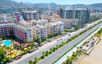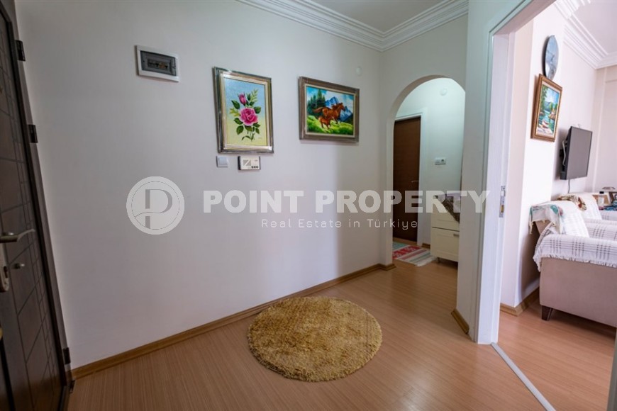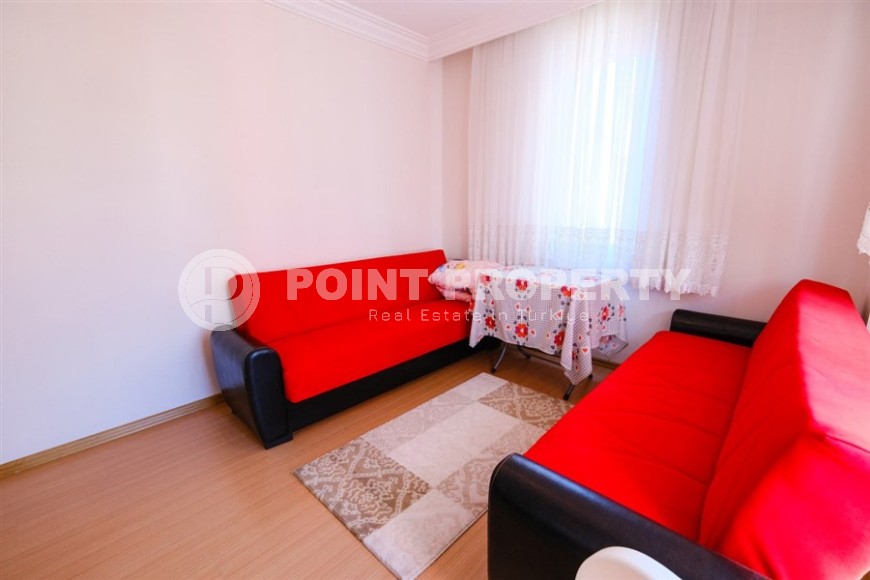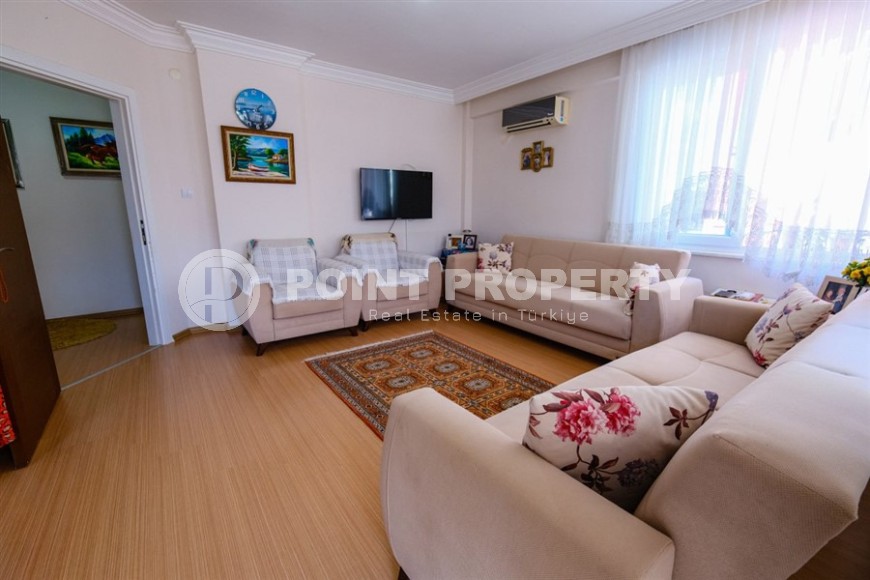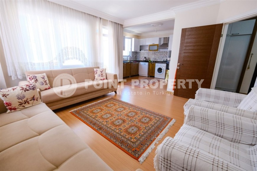 If, when choosing an apartment, the key criteria for you are affordable price and distance to the beach, we suggest paying attention to the apartment in the center of Mahmutlar, on the first line from the sea. Apartment 2+1, with a total area of 95 m2, is located on the 5th floor in a house built in 1998, and consists of a living room combined with a kitchen, divided into a dining area and a living room, two bedrooms, two bathrooms and two open balconies overlooking the city . The apartment is bright and spacious, with all the necessary furniture and household appliances. The living room is equipped with soft sofas and armchairs, a classic spacious kitchen, with lots of spacious sections for storing food, is equipped with a refrigerator, dishwasher, washing machine, and oven. The bedroom has a large bed and a spacious wardrobe, and one of the rooms has a relaxation area with comfortable sofas. The spacious balcony, overlooking the city, has everything for a pleasant pastime - comfortable wicker furniture, umbrellas and a comfortable sofa.