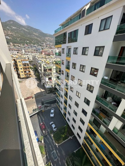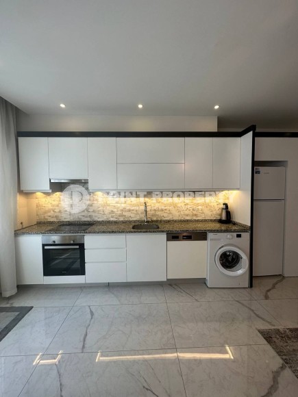 We present to your attention an apartment with a top location within walking distance from the sea and the center of the popular Mediterranean resort - Alanya. It is located on the 7th floor of a residence commissioned in 2021 and consists of a kitchen combined with a living room, a bedroom, a bathroom equipped with a shower and an open balcony overlooking the city streets. The total area of the apartment is 60 m2, however, thanks to the zoning of the territory and the light, laconic interior, the apartment visually seems much more spacious. In the center of the living room there is a comfortable seating area with a massive corner sofa, a bookcase, a coffee table and a side table. There is a dining table with soft chairs by the window. The practical kitchen is equipped with a refrigerator, washing machine, dishwasher, touch surface and oven. The bedroom is equipped with a large bed, dressing table and wardrobe, and on the balcony there is a set of compact garden furniture.