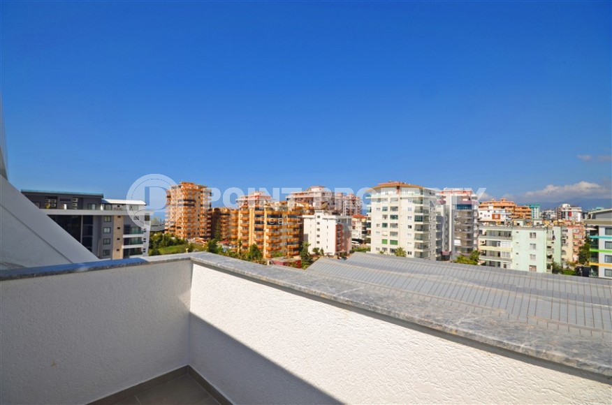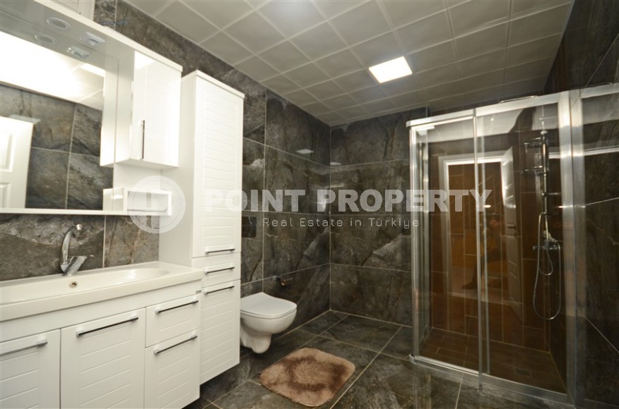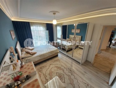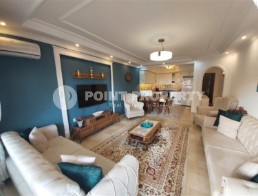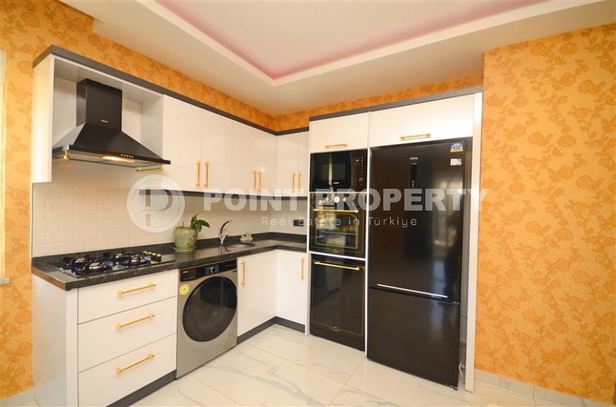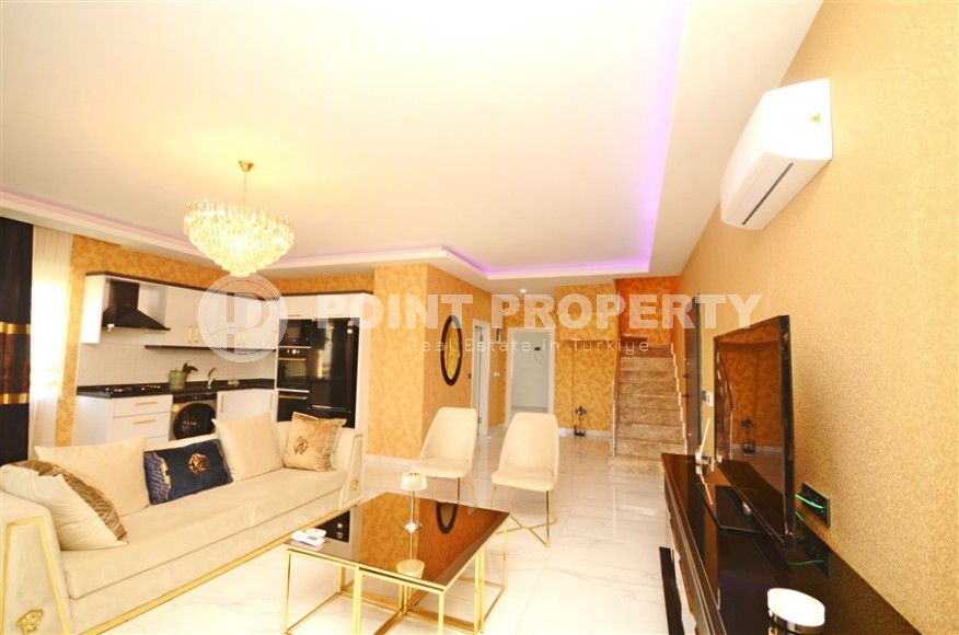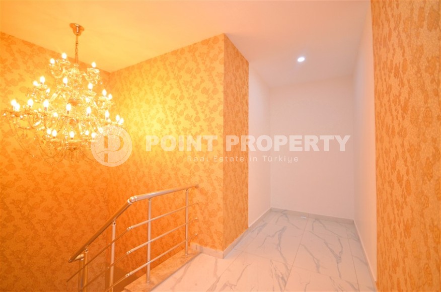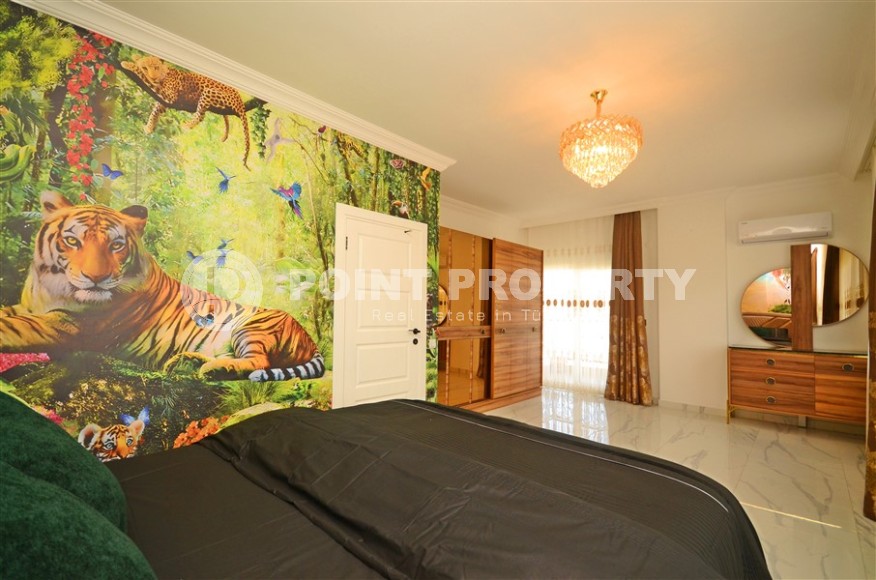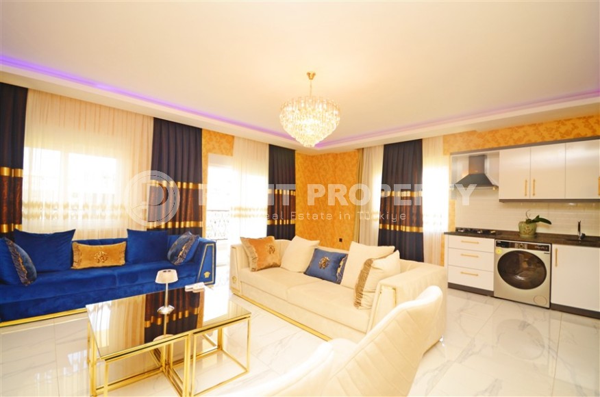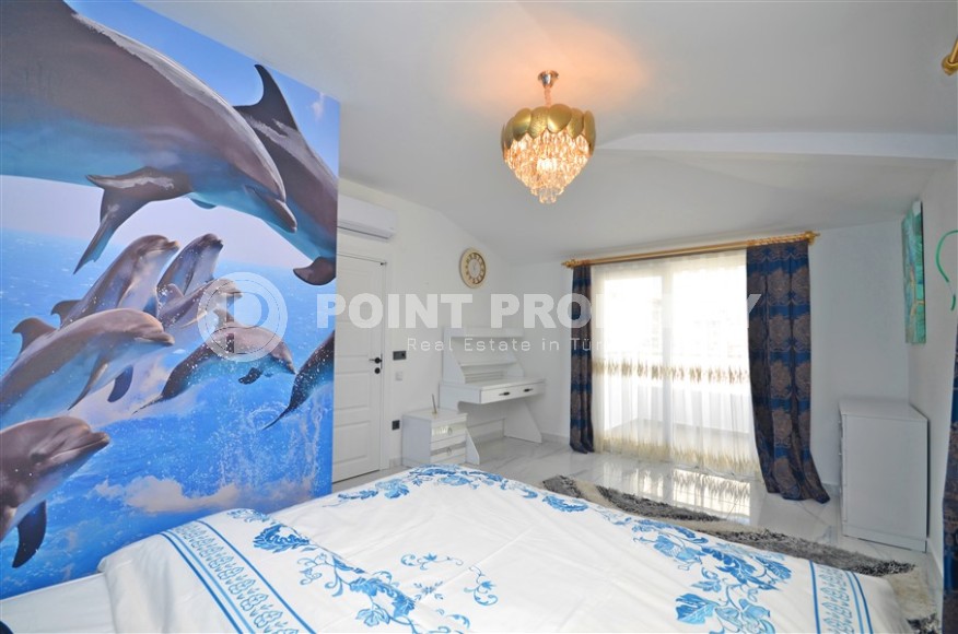 This section presents a comfortable apartment that is perfect for both summer holidays and permanent residence. It is located within walking distance from the sea and the center of the prestigious area of Alanya - Kargicak, on the 5th floor with an attic in a residential complex built in 2022. The layout of the duplex, with a total area of 170 m2, includes an open kitchen combined with a living room, three bedrooms, three bathrooms equipped with showers, two balconies and a spacious terrace overlooking the banana grove, the city and the sea. The apartment has been renovated to a high standard, stylish furniture and the latest household appliances have been installed. A cozy living room, with amber-colored wallpaper and a massive chandelier, is equipped with soft sofas, armchairs, a coffee table and a side table. The functional corner kitchen is equipped with a refrigerator, washing machine, dishwasher, hob and oven. The bedrooms, with original prints on the walls, have large beds and modern fittings, so new owners do not have to worry about furnishing the apartment.