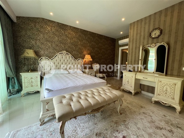 In the prestigious, quiet area of Alanya - Kargicak, surrounded by picturesque nature, perennial coniferous forests and green mountain slopes, on the very shore of the Mediterranean Sea, a luxury residential building was built in 2021 complex, with a “city within a city” infrastructure. Hundreds of lucky people have already become full owners of apartments in this residence, and if you also want to join their number, you still have this opportunity. Currently, in one of the buildings of the complex, a large two-level apartment located on the 5th floor with an attic is for sale. The total area of the duplex is 210 m2, the 3+1 layout is represented by an American open kitchen, living room, three bedrooms, four bathrooms, an open balcony, and two panoramic terraces overlooking the sea. The original design of the apartment successfully combines elements of different classical styles, the walls of the rooms are decorated with openwork wallpaper in calm shades, and heavy curtains matched to match, exclusive furniture and decorative items create a special, mysterious atmosphere. The living room visually resembles a Gothic hall, with a large table in the center, a luxurious antique chest of drawers, elegant chairs and mirrors in massive gilded frames. The kitchen, on the contrary, is modern and laconic, and is equipped with the latest technology. Each bedroom is original and unique, one of them has an entourage wardrobe, the other has an ivory-colored suite with golden openwork carvings. However, all rooms correspond to the general idea and are equipped with all the necessary furniture. Every detail in the apartment design is self-sufficient and thought out to the smallest detail, and carries not only a functional, but also an aesthetic load.