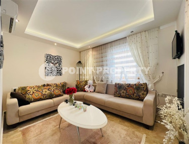 The entrance to the apartment is located on the top floor, and going down the stairs you find yourself on the lower floor of the duplex. On the top floor there is a spacious living room with stylish upholstered furniture, combined with an American-style kitchen and dining area. The kitchen is equipped with the necessary furniture with a granite worktop and plenty of storage space for kitchen equipment. From the living room you can access a large balcony overlooking the Toros Mountains in the distance. In the entrance area there is one of 2 complete bathrooms with a shower. In their hallway, a convenient staircase leads to the lower floor of the apartment in a private area. On the ground floor of the duplex there are three bright furnished bedrooms and another complete bathroom. Two bedrooms have access to a spacious terrace from which you can go down to the garden and the pool.