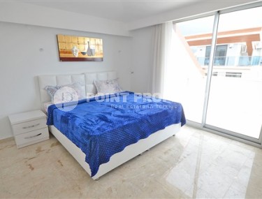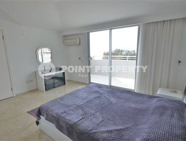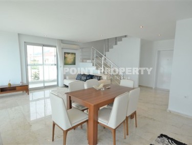 Just 100 m from the beach and landscaped promenade in one of the most prestigious areas of Alanya Kestel, a two-level apartment 2+1 with a private garden is for sale. The apartment with designer renovation with a total area of 170 m2 is located on the southwest side. On the ground floor there is a large living room combined with a kitchen and a bathroom with a shower. In the corridor area there are spacious closets and a niche under the stairs, where you can hide suitcases, all kinds of household items, etc. The kitchen is made in black, from household appliances there are two refrigerators, one of which is built-in, a dishwasher, an electric hob, an extractor hood, an oven and a microwave, and the wall in the dining area is decorated with natural stone. Also, the kitchen has a filter for drinking water.