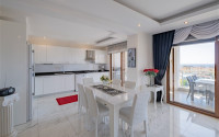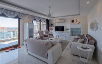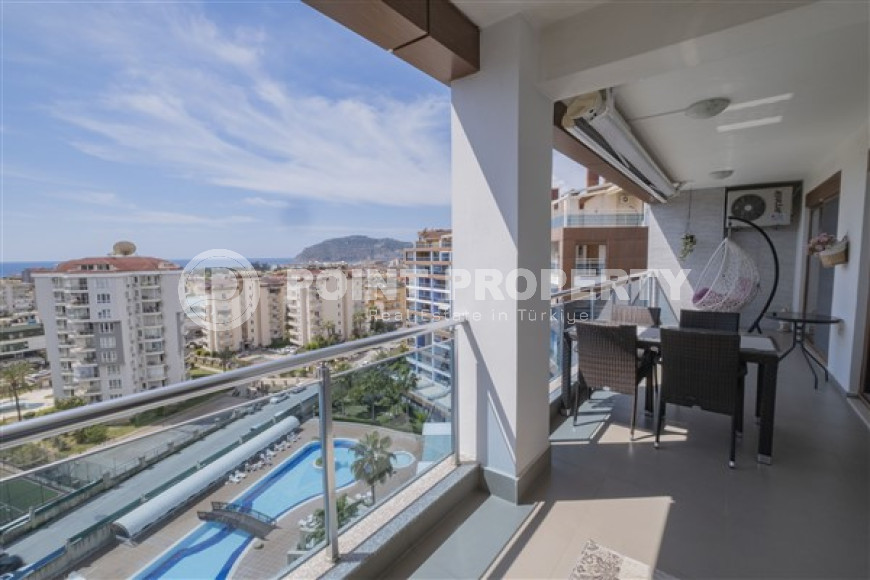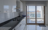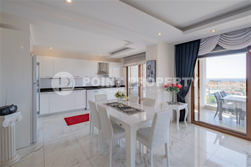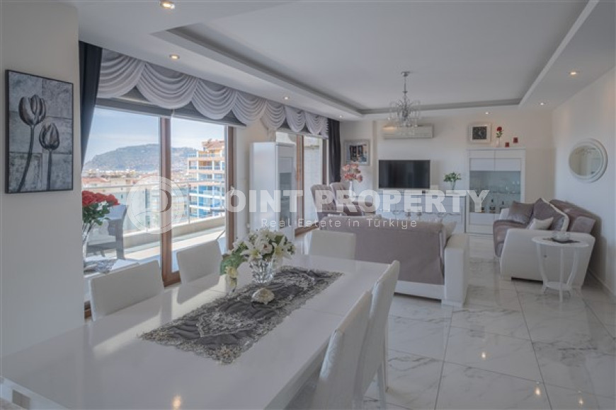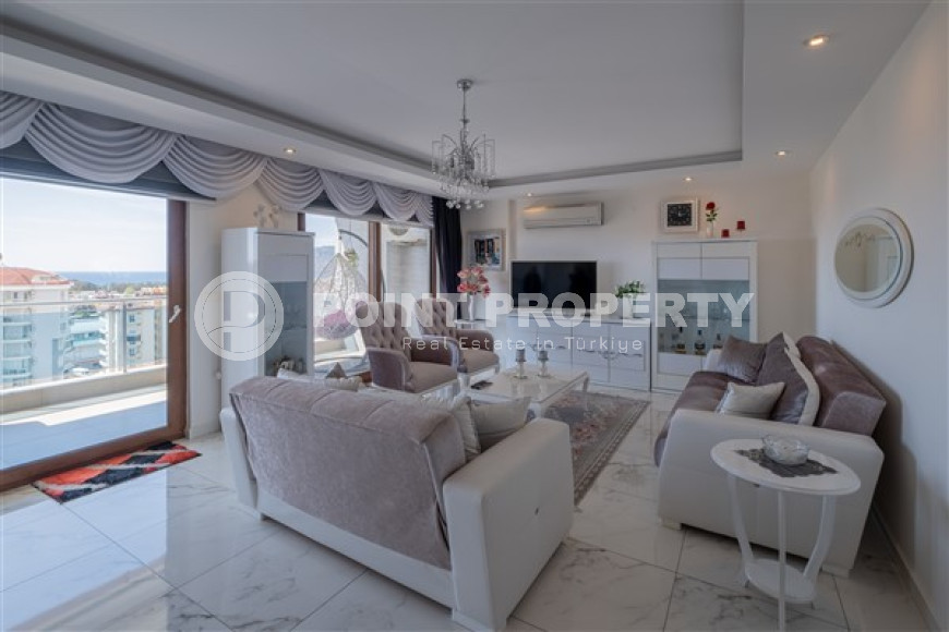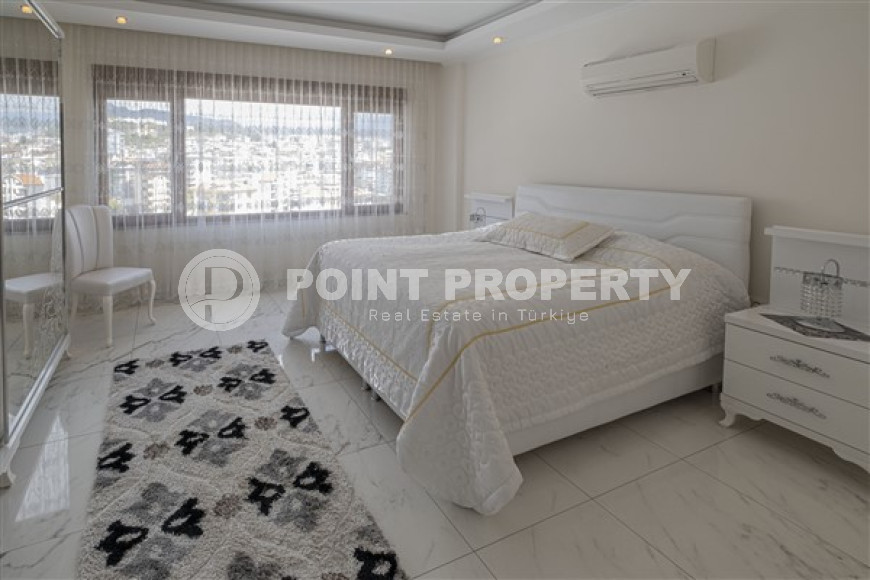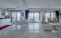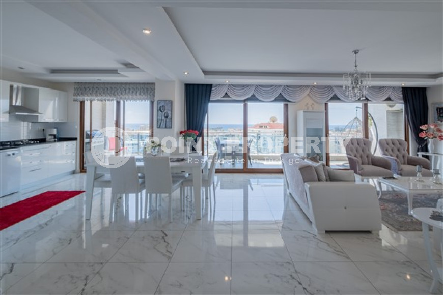 We invite you to purchase a spacious duplex apartment with a total living area of 250 m2, located on the 9th floor of a complex built in 2013, with an additional exit and a terrace. The four-room apartments with a 3+1 layout also have three bathrooms and a balcony. The presented furniture is included in the price of the premises. The living room has beautiful sofas and armchairs in light colors with cabinets, a TV, and mirrors on the walls. The kitchen is equipped with the necessary household appliances. The living room has direct access to the balcony. A staircase leads to the upper floor, where there are spacious bedrooms. The bathrooms have new fixtures and a hydromassage bathtub.