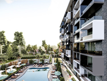 Apartments with a 1+1 layout, located in a complex in Alanya's Mahmutlar area, are for sale. The apartment with a total area of 50 m2 is located on the 6th floor on the south side. The layout includes a corridor, a living room combined with a kitchen, a bedroom, a bathroom with a shower and a balcony with a beautiful view of the banana grove. The apartment is equipped with all necessary furniture and household appliances.