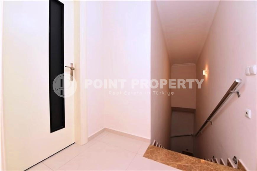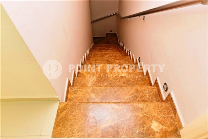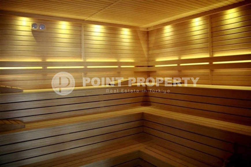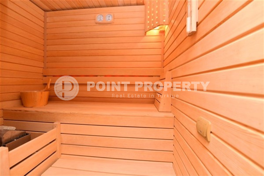 If you want to wake up in the morning, drink a cup of strong Turkish coffee on your balcony, admiring the endless Mediterranean Sea, and in the evening admire the amazing Alanya sunsets from the terrace? Then check out the new property in our portfolio. The owner offers a cozy two-bedroom penthouse, 2+1 layout, with an area of 103 m². Magnificent two-storey apartment, with elegant furnishings and stunning views. The layout includes a living room combined with an open American kitchen, which is located on the ground floor. In the hallway there is a large wardrobe for outerwear and a bathroom. There is also a staircase to the upper floor, and a storage room is located under the stairs. The living room has huge panoramic windows offering an unparalleled view of the Alanya fortress and the azure sea. There is a slightly separate dining area for 6 people, next to the exit to the balcony. On the second floor there are two bedrooms, two bathrooms and a private sauna. The apartment is fully furnished, furniture and household appliances are of good quality. The bathrooms are equipped with high-quality sanitary ware, and two bathrooms have spacious showers, and the third has a Jacuzzi. A heated floor system is installed throughout the apartment. Even though the area of the apartment is not very large, all the space is used very ergonomically, and additional storage spaces are equipped. In addition, the owners of this penthouse have a private garage on the entrance floor of the block.