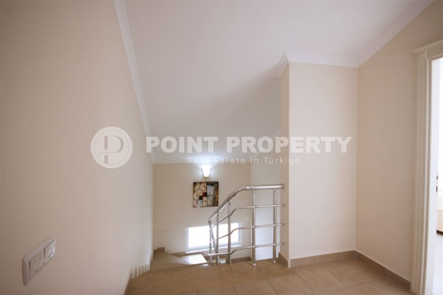 In this section we present to your attention a large two-level 4+2 apartment with a total area of 250 m2, located on the 4th floor with an attic, in the central part of the popular Mediterranean resort - Alanya. The layout of the duplex includes a large living room combined with a kitchen, a salon, four bedrooms, three bathrooms, two of which are equipped with a shower and a bath, two open balconies, and a panoramic terrace overlooking the sea and Mount Calais. The design of the apartment is restrained and laconic, with a predominance of warm light shades in the interior, and bright accents in the form of paintings. This is convenient because, if desired, the new owners can easily give the apartment their own style and individuality. The spacious living room on the 1st floor of the apartment is visually divided into two functional areas - a living room, with comfortable armchairs, a sofa and a coffee table; and a kitchen area, with a dining table and a set equipped with built-in appliances. From the living room there is access to the balcony, where there are comfortable wicker chairs and a table. The bedrooms are equipped with soft beds, bedside tables, dressing tables and wardrobes. In the salon on the 2nd floor of the apartment there is a comfortable lounge room, with a soft corner sofa, an armchair, a pouf, a coffee table and a cabinet, there is also a compact kitchen, with a small refrigerator and a sink, which allows you to have picnics on the terrace, where there are sun loungers for sunbathing and garden furniture. A floor heating system is installed throughout the apartment, which is also very convenient and practical.