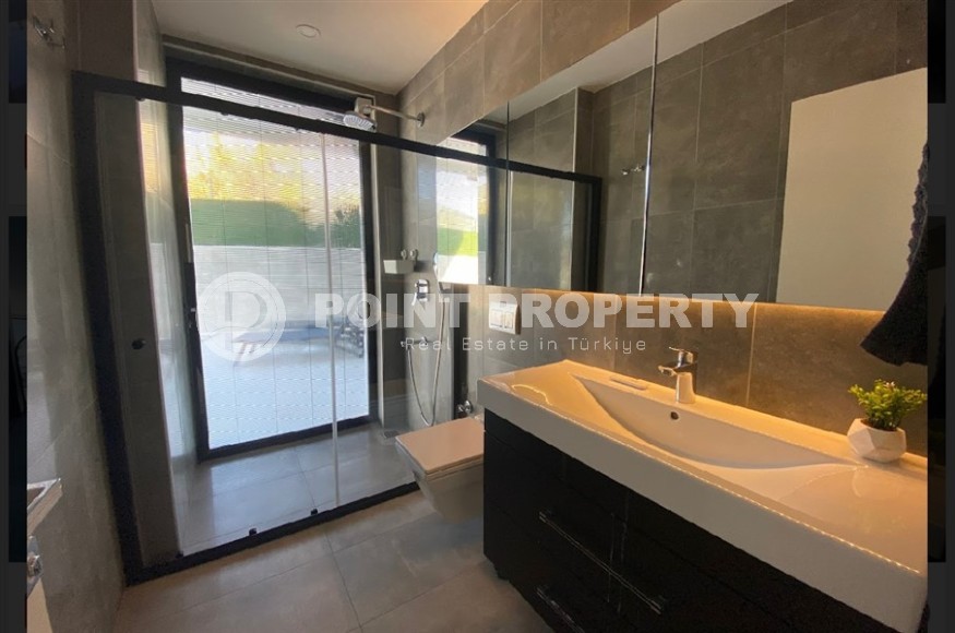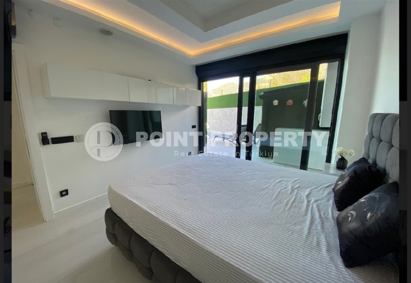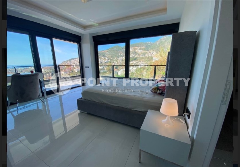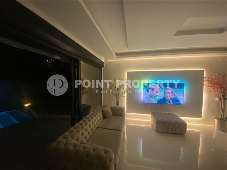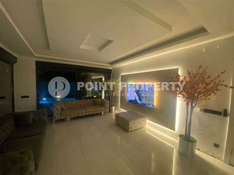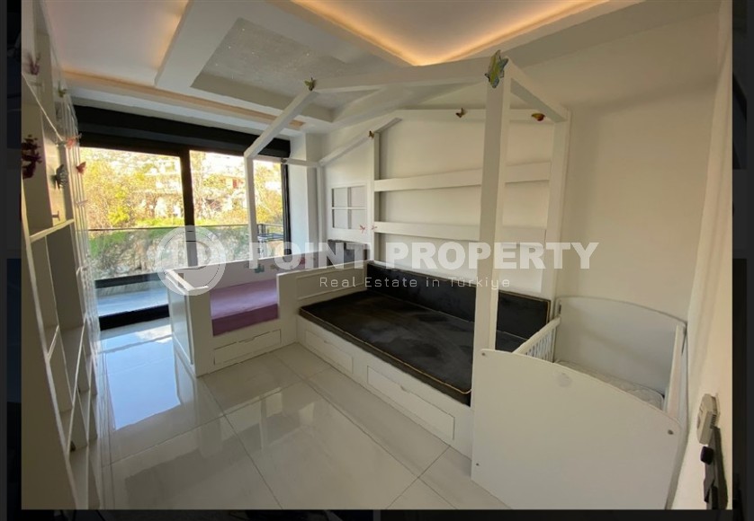 Hasbahce is a small, cozy area of Alanya, located near the city center, on the hills, offering stunning panoramic views of the sea and Mount Kale. This part of the city is considered one of the most prestigious, calm and safe, and is also distinguished by its excellent ecology, abundance of greenery, and cooler microclimate. In this In a picturesque area, an elite two-level apartment is for sale, with a private pool and garden, located on the 1st and 2nd floors of a house built in 2019. The total area of the duplex is 500 m2, the layout includes an American open-type kitchen, a large living room, four spacious bedrooms, five bathrooms and two balconies with luxurious views of the sea and mountains. The apartment is stylish and modern, with a laconic design, multi-level soft lighting, a bright interior, and a minimum of bright accents, which makes it easy to give it your own style and personality, and create comfort. In the duplex, everything is ready for the arrival of new owners - the living room is equipped with comfortable sofas, a pouf and a large dining table, the bedrooms have comfortable beds and sets, the children's room has compact beds and a functional stand with shelves. The stylish black and white kitchen is equipped with built-in appliances, and the bathrooms are equipped with high-quality ceramics and sanitary ware.