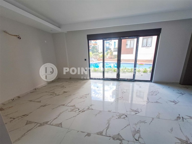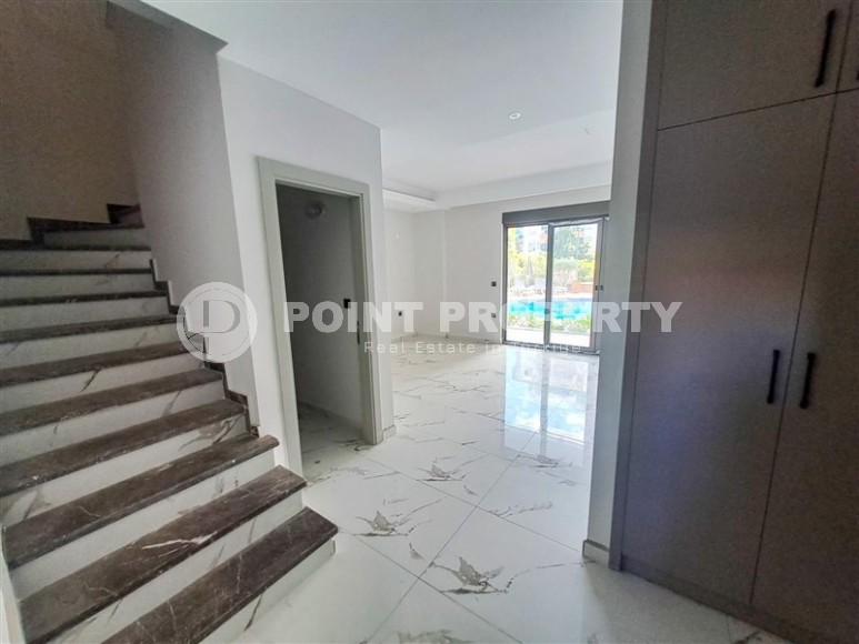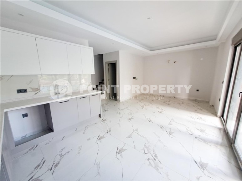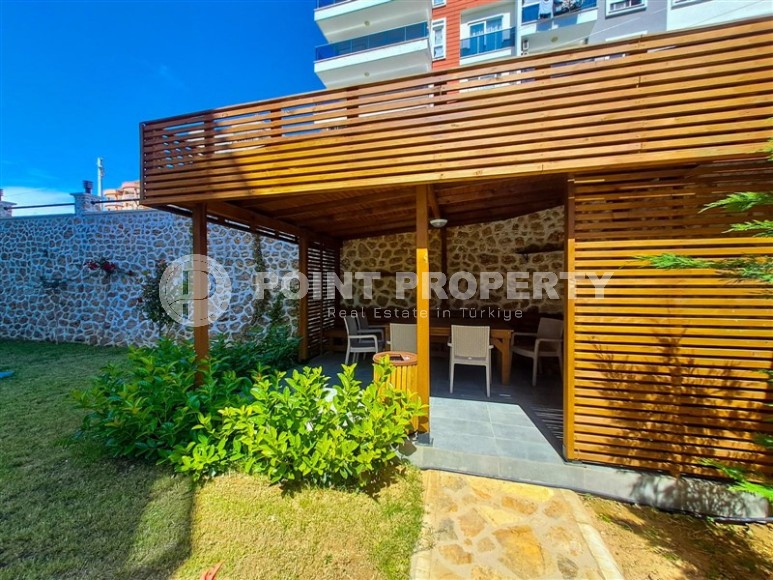 The offered apartment is located on the first two floors, consists of two levels, has an area of 100 sq.m., containing two bedrooms, three bathrooms, a living room with an open plan kitchen, a balcony and a separate green area in the form of a garden. The apartment is being sold completely renovated: flooring, built-in kitchen units, plumbing fixtures in the bathroom, waterproof coating on the walls, interior and entrance doors. The new owner will only have to purchase furniture and household appliances, which Point Property will help with after-sales service. We provide a car and driver who will take you to any furniture and equipment store in Alanya.