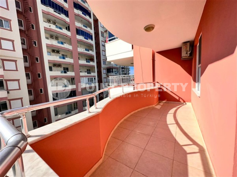 An apartment in the Mahmutlar area with a total area of 115 m2 with two bathrooms and two luxurious balconies is for sale. The apartment is located on the fifth floor of a high-rise building and has a 2+1 layout with two bedrooms. The favorable location of the property, 250 meters from the Mediterranean Sea and only 100 meters from the attractions of the area located in its central part, gives this option a certain exclusivity. The apartment is sold furnished. The kitchen unit is equipped with a hood, dishwasher, oven, and refrigerator. The living room is equipped with sand-colored furniture, a corner sofa and a table for several people. The bedrooms have beds. A door from one bedroom leads to a compact bathroom. The second bathroom is equipped with a shower and a water heater.