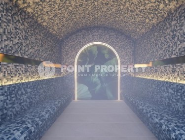 The complex's amenities include an outdoor swimming pool, water park, barbecue, garden, bar, billiards, bicycle parking, steam room, children's pool, fitness room, video surveillance, hammam, pool bar, jacuzzi, and generator. The distance to the sea is 600 meters, and to the district center is 150 meters.