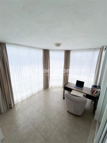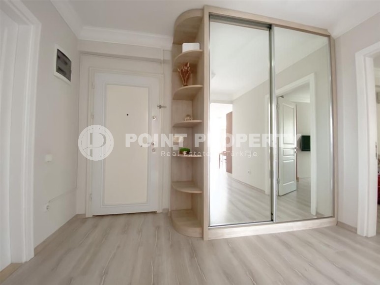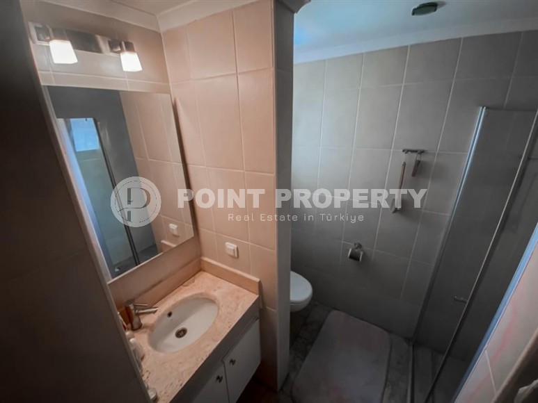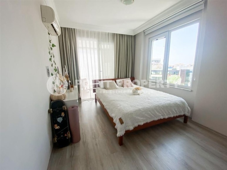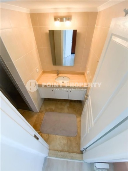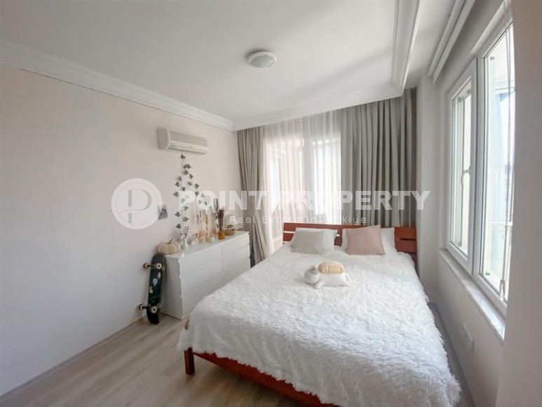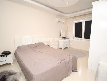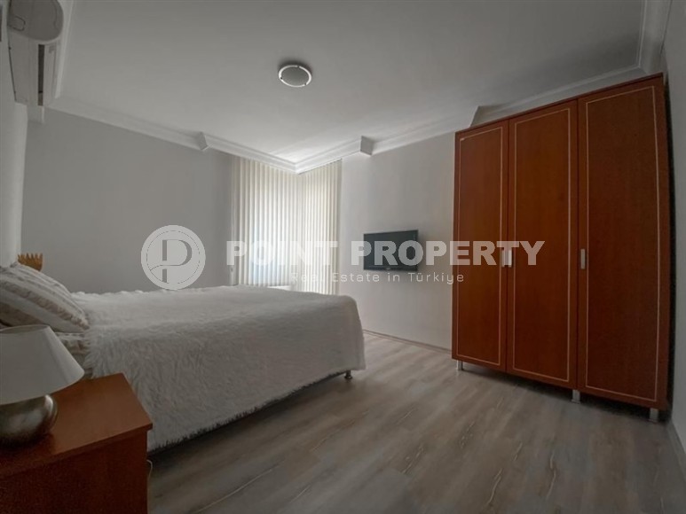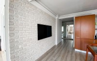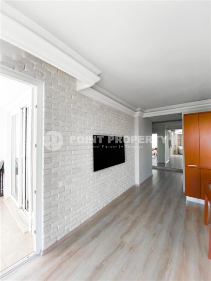 In the center of the modern area of Alanya - Cikcilli, on the 5th floor in a comfortable residential complex with hotel infrastructure, built in 2009, an apartment is for sale. Spacious for a 2+1 layout, with a total area of 110 m2, it consists of a living room combined with a kitchen, two bedrooms, two bathrooms equipped with showers and two balconies. The apartments have been renovated to a high standard, with modern furniture and all the necessary appliances installed. The living room, with a brick wall in a loft style, is equipped with a soft sofa, an armchair and a dining table. The classic wood-colored kitchen is equipped with a built-in refrigerator, dishwasher, hob and oven. The cozy bedrooms are equipped with comfortable beds, bedside tables, a chest of drawers and a wardrobe; at the entrance there is an additional spacious wardrobe for shoes and outerwear, and on the balcony there is a study with a desk.
