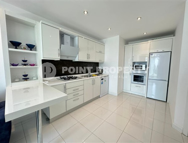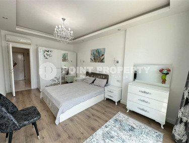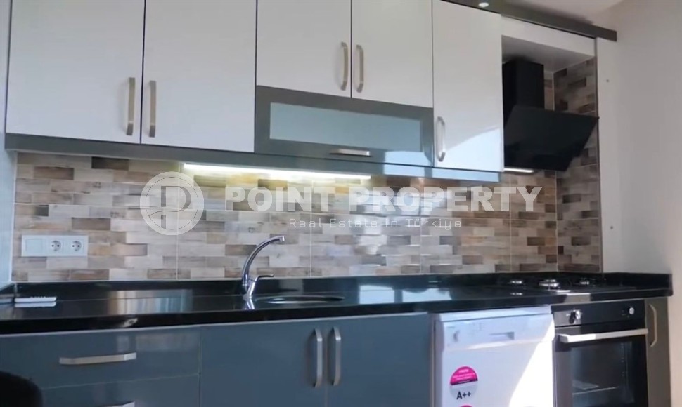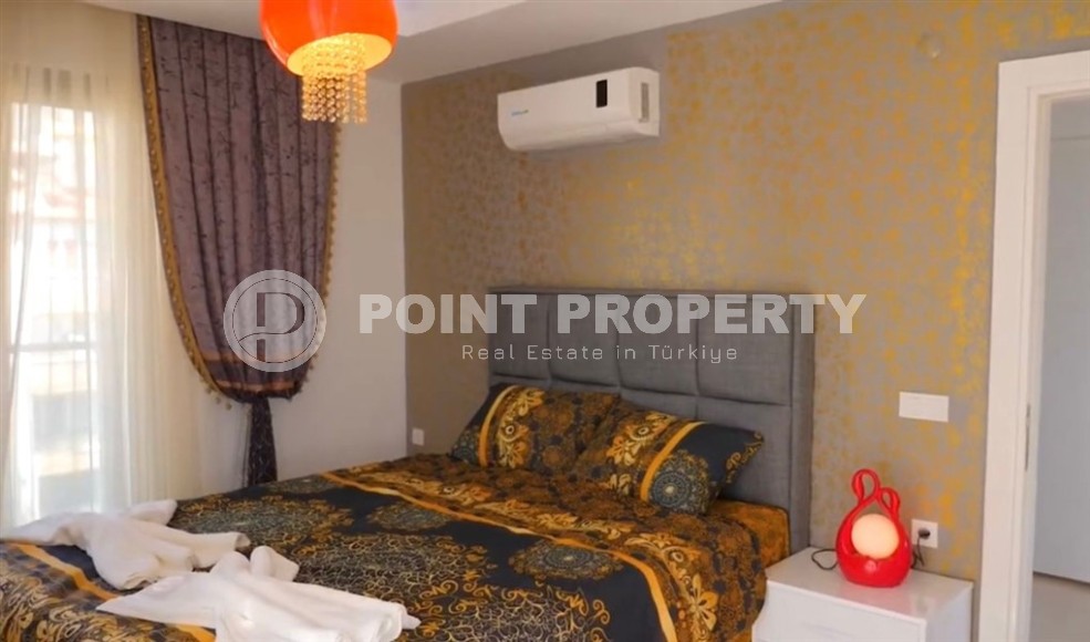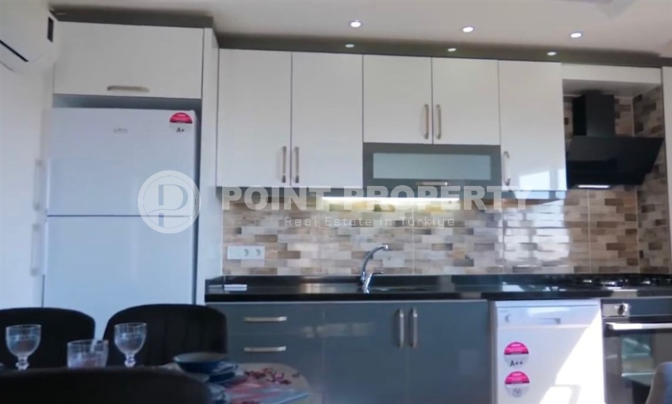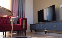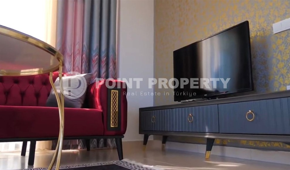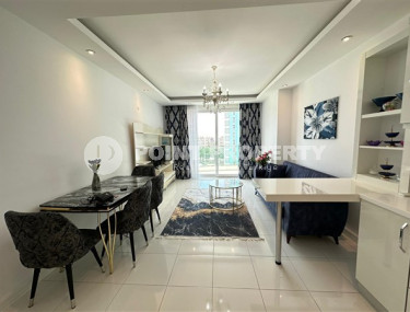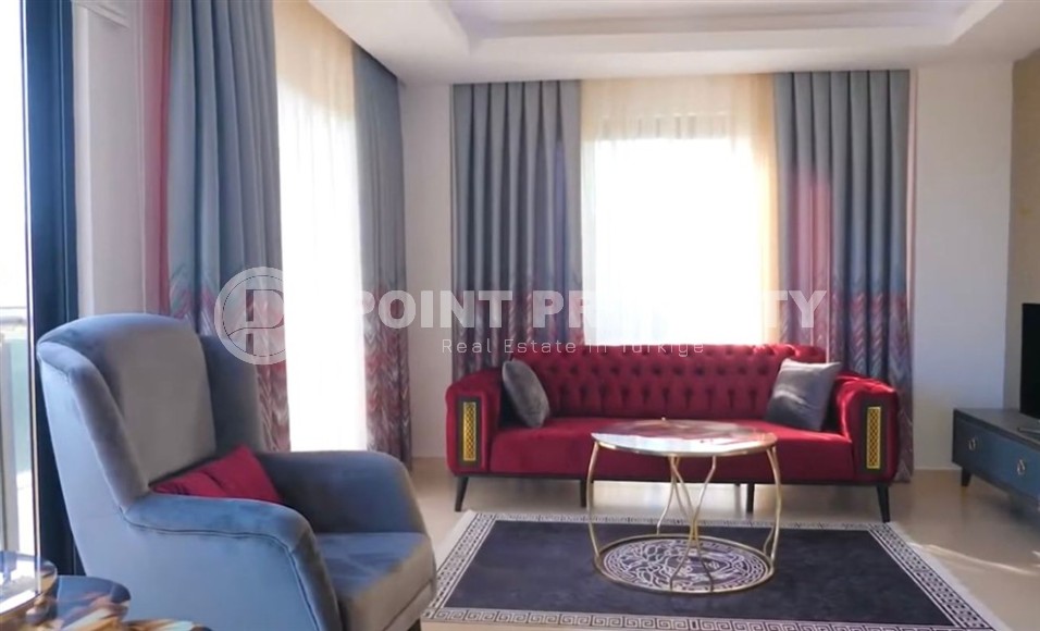 In the prestigious area of Alanya - Kestel, there is an apartment for sale that will surely suit your taste. Small, with a total area of 60 m2, it has a layout combined with a kitchen, a living room, a bedroom, a bathroom and an open balcony overlooking the sea. The apartment is located on the 3rd floor in a residence built in 2018, in a prestigious area of Alanya - Kestel. Calm and picturesque, it is ideal for those who prefer a relaxed lifestyle. The apartment has been newly renovated, comfortable furniture and all necessary household appliances have been installed. The modern design successfully combines velvet and satin textures, gold elements, soft lighting and calm shades in the interior. The living room is equipped with massive armchairs, a sofa, coffee tables, a side table and a dining table. The practical kitchen is equipped with a refrigerator, dishwasher and oven, and the bedroom has a comfortable bed and furniture. New owners will be able to enjoy a comfortable atmosphere immediately after completing the transaction, without wasting time on arranging the apartment.