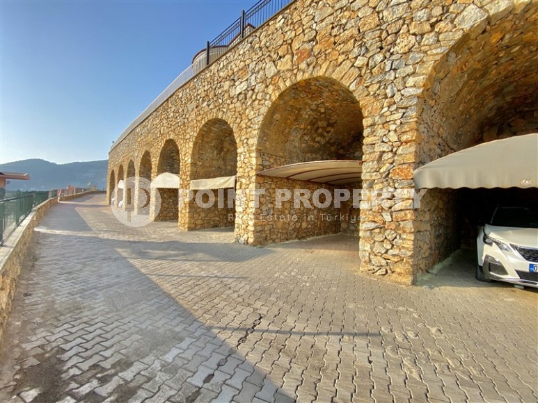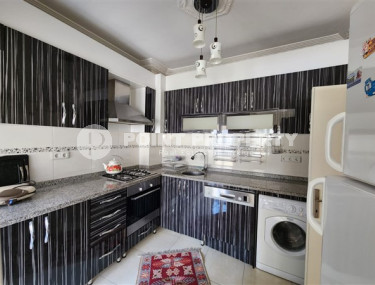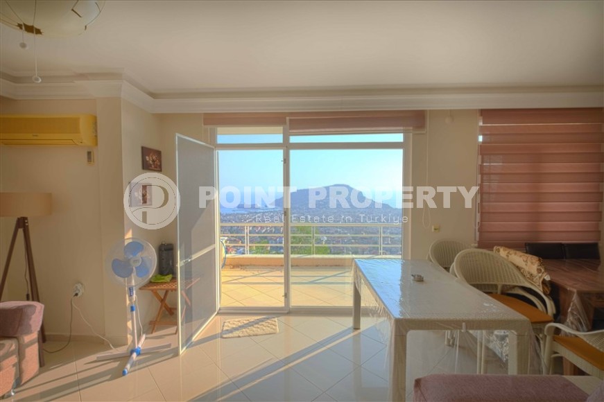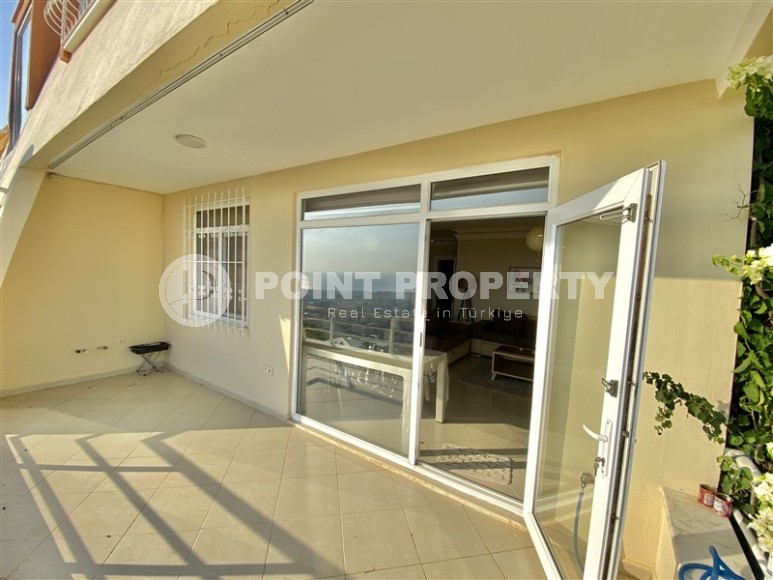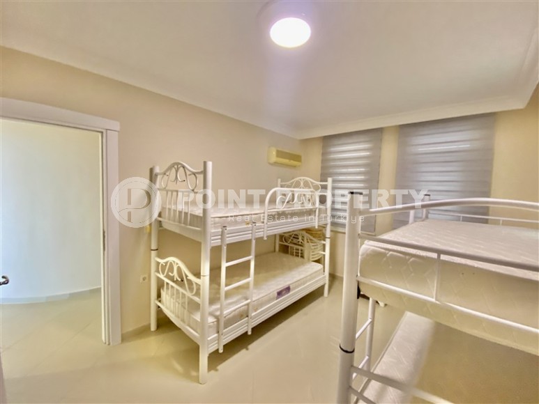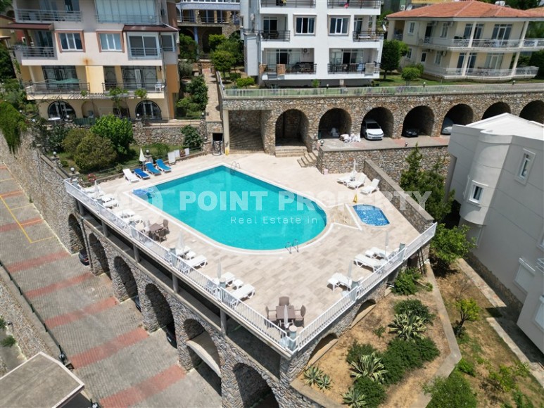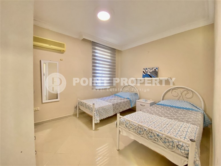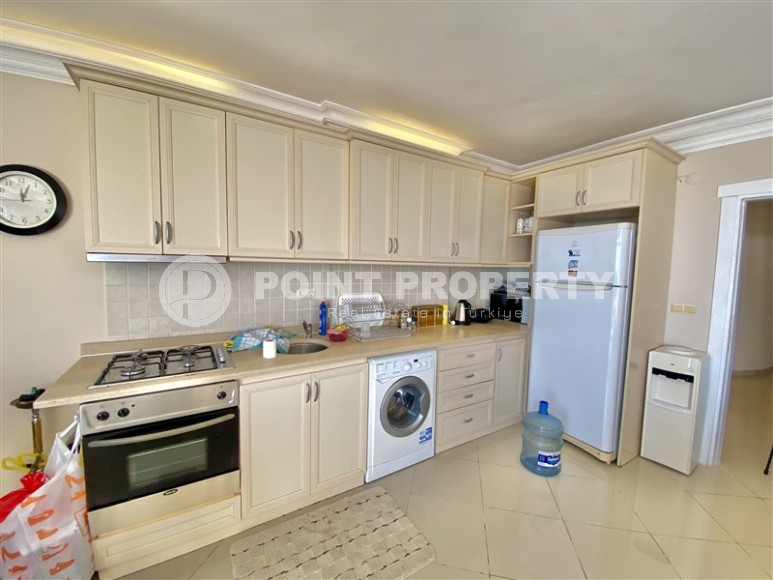 In the elite, quiet area of Alanya - Bektas, on a mountain with breathtaking views of the sea, the port and the Alanya fortress, an atmospheric residential complex was built in 2005, cascading on picturesque hill. An apartment is for sale on the 1st floor in one of its buildings, so if you are inspired by picturesque landscapes, panoramas of the sea and mountains, you should pay attention to this comfortable apartment. Its total area is 110 m2, the 2+1 layout consists of a living room combined with a kitchen, two bedrooms, two bathrooms and two open view balconies. The apartment is bright and cozy, with a predominance of warm sand tones in the interior. In the center of the living room there is a comfortable seating area, with soft sofas and a coffee table; closer to the kitchen there is a dining table. The classic, practical kitchen is equipped with a refrigerator, washing machine and oven. From the living room there is access to a spacious panoramic balcony, from where, in full view, you can see the city, the endless sea and the symbol of Alanya - Mount Kale. The cozy, bright bedrooms are equipped with comfortable beds, and one of the rooms has compact bunk beds. In addition, the apartment has a set of garden furniture for the terrace, where the new owners can spend time pleasantly, enjoying the tranquil atmosphere and picturesque views.