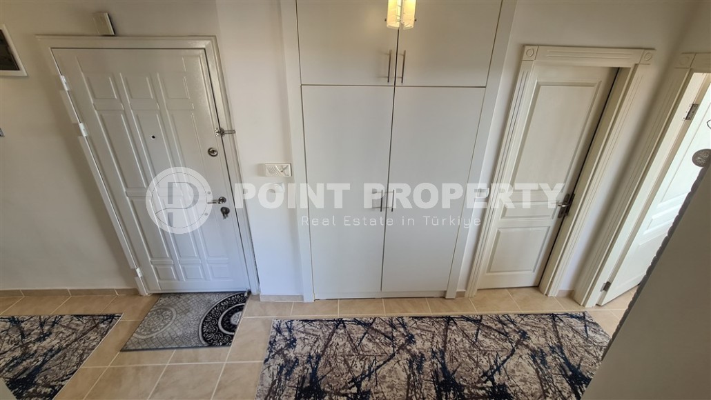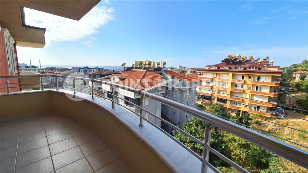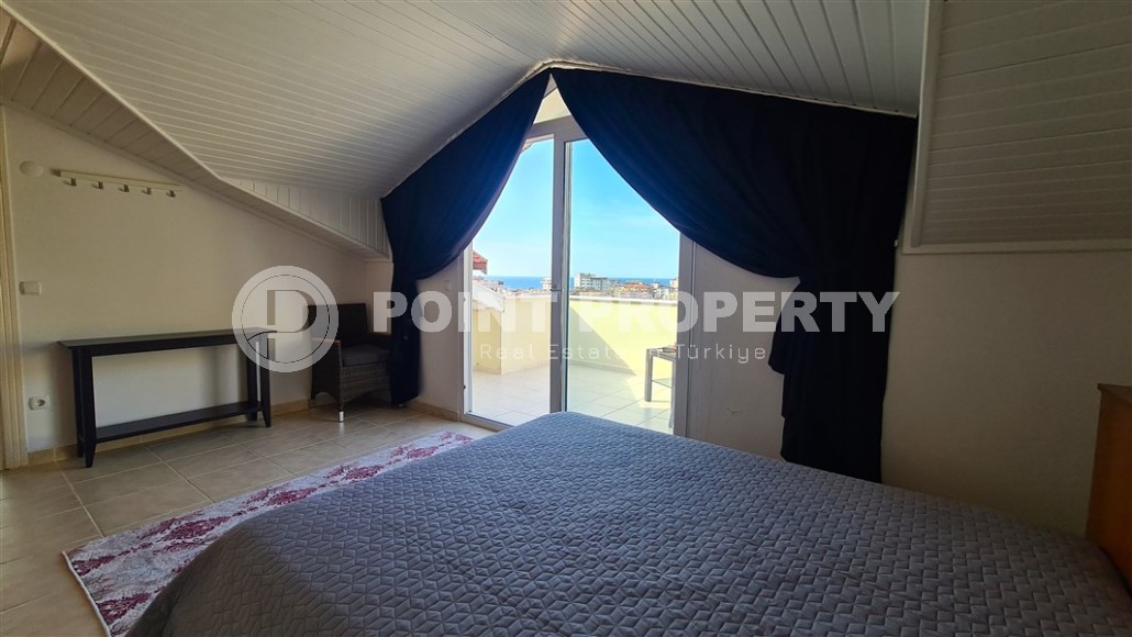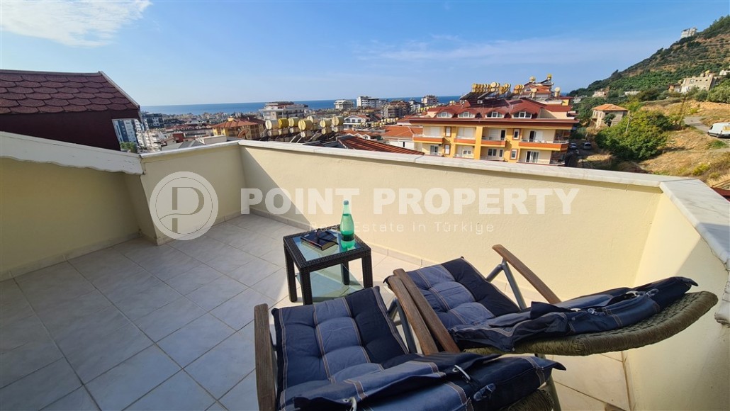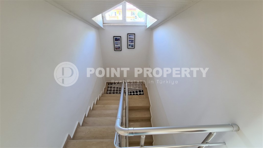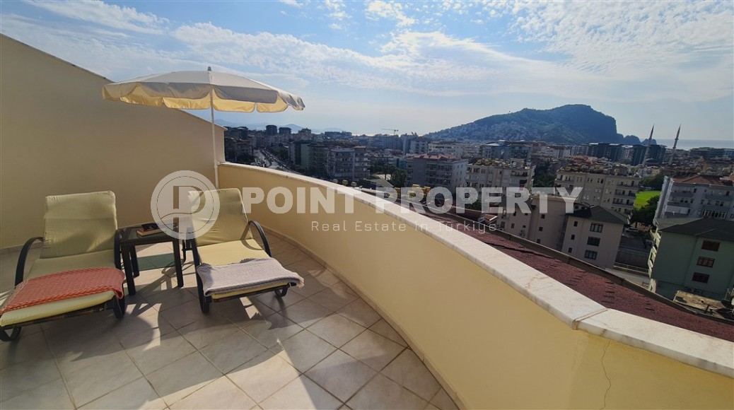 The duplex is located on the 4th floor with an attic in a residence built in 2010, on the territory of which there is a green garden and an outdoor swimming pool. It is located two kilometers from the center of Alanya, where supermarkets, shopping and entertainment complexes, cafes, restaurants, beauty salons, fitness clubs, children's educational institutions and other urban infrastructure facilities are concentrated; and two and a half kilometers from a luxurious sandy beach and a landscaped promenade.