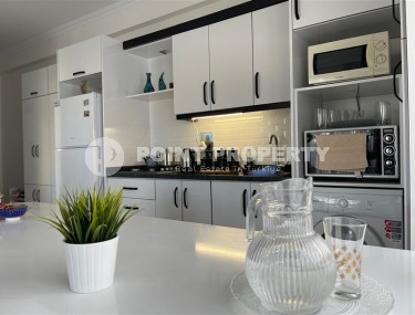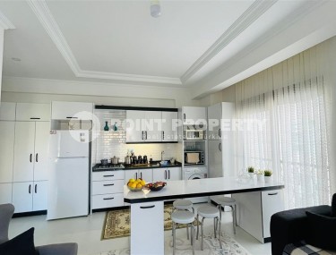 The prestigious area of Alanya - Kargicak - is an ideal place for those who dream of a quiet life in the lap of nature, surrounded by beautiful mountain panoramas, picturesque landscapes, citrus gardens and an atmosphere of harmony and balance. In the center of this green, ecologically clean area, a modern residential complex was built in 2021, with its own territory and organized internal infrastructure, and on the 2nd floor in one of its buildings a small apartment is for sale. Its total area is 57 m2, the 1+1 layout consists of a living room combined with a kitchen, a bedroom, a bathroom and an open balcony overlooking the courtyard of the residence and banana groves. The apartment is equipped with all necessary furniture and household appliances and is ready to move in. The living room has a comfortable corner sofa, a coffee table, a side table and a dining table with soft chairs; in the bedroom there is a large bed, bedside tables, a wardrobe and a dressing table. The compact kitchen is equipped with a refrigerator, washing machine, dishwasher, touch surface and oven, and the bathroom is equipped with a stylish shower. The new owners will only have to create coziness, which can easily be done with the help of curtains, paintings or decorative items.