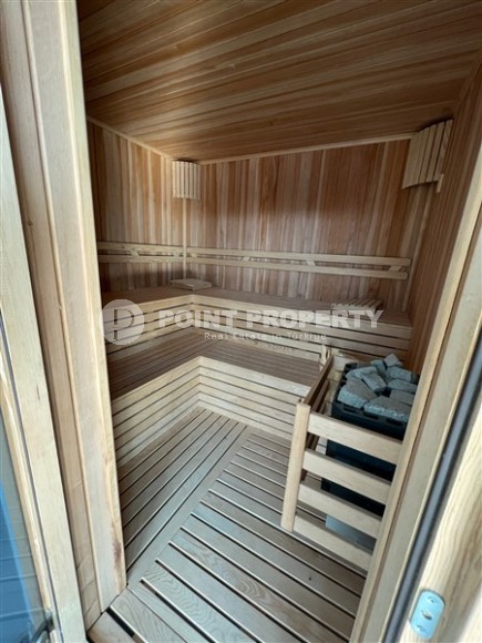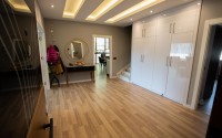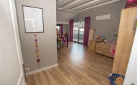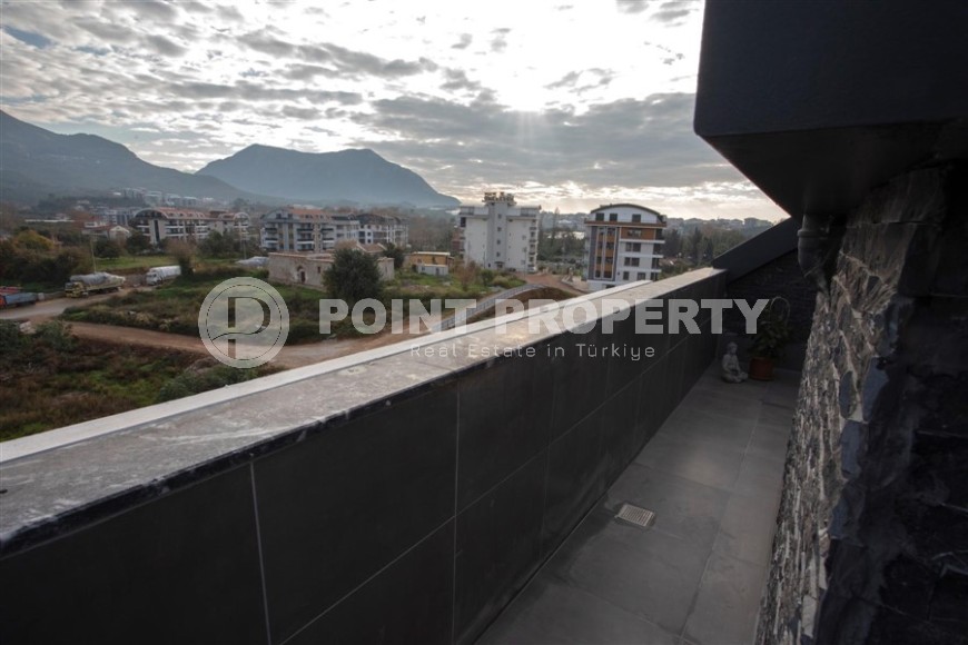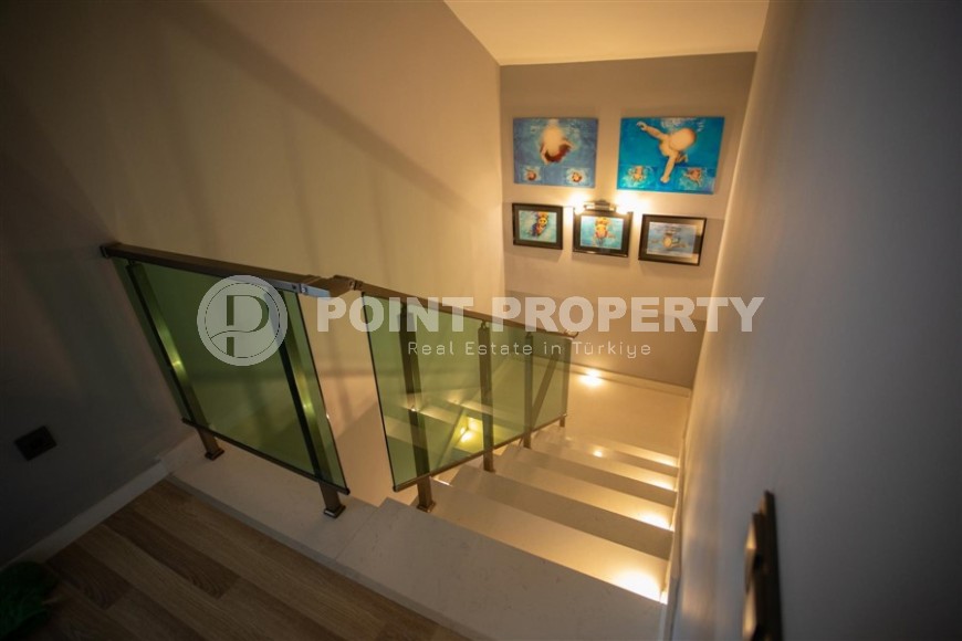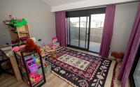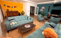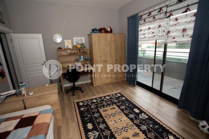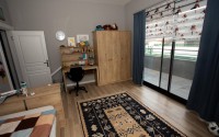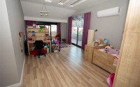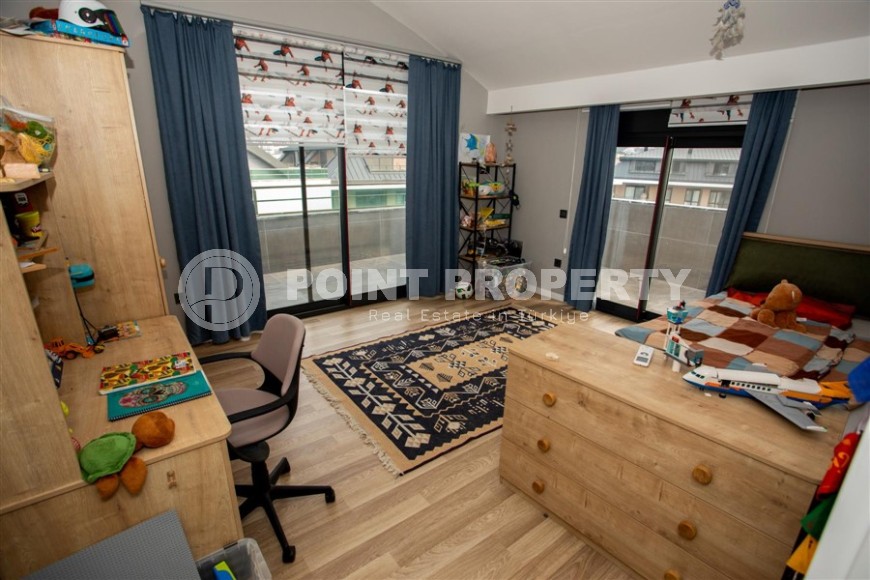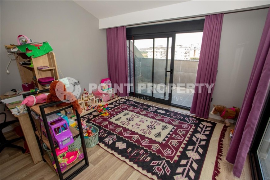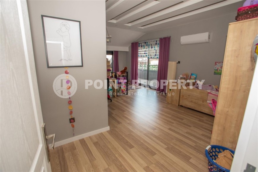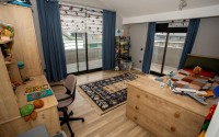 This section presents a spacious two-level apartment, which is perfect for a large family. It is located on the 4th floor with an attic in a modern residential complex, built in 2022 in a calm, picturesque and environmentally friendly area of Alanya - Upper Oba. The apartment layout, with a total area of 285 m2, includes a separate kitchen, living room, four bedrooms, three bathrooms equipped with showers, two balconies and a spacious outdoor terrace overlooking green mountain peaks and banana plantations. The apartment is stylish and modern, with bright wall fragments, original paintings, and wooden cabinet furniture in eco style. The salon has two seating areas with soft sofas, a coffee table and a massive chest of drawers, and comfortable armchairs and a nightstand. The spacious kitchen, with a large dining table, is equipped with the latest technology. The parents' bedroom has a comfortable bed, the two children's bedrooms, in addition to compact beds and wardrobes, are equipped with work corners and a play area, and one of the rooms is reserved for a study with a desk, a practical stand with open shelves and a wardrobe. The hallway has a spacious built-in wardrobe, and on the balcony there is a stylish recreational space with soft, compact sofas.