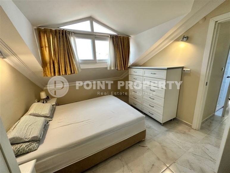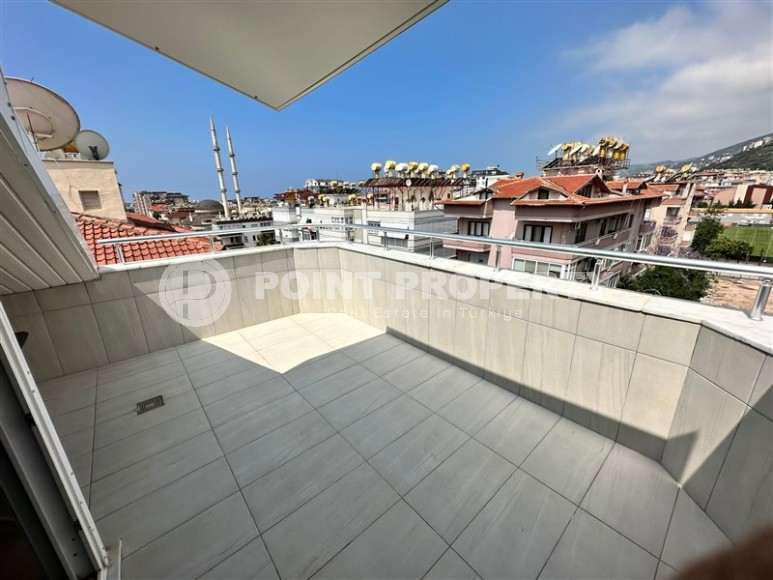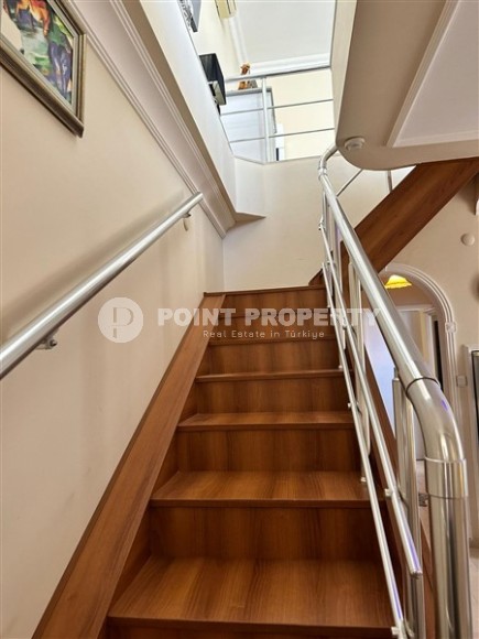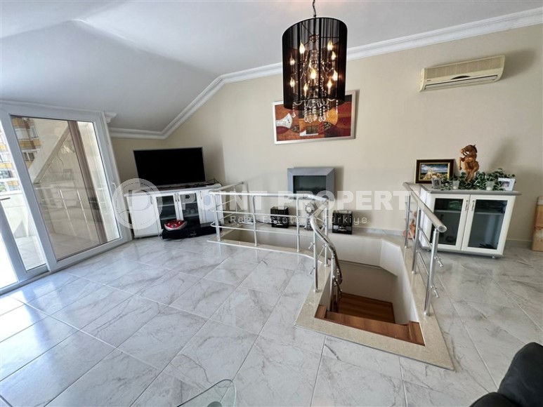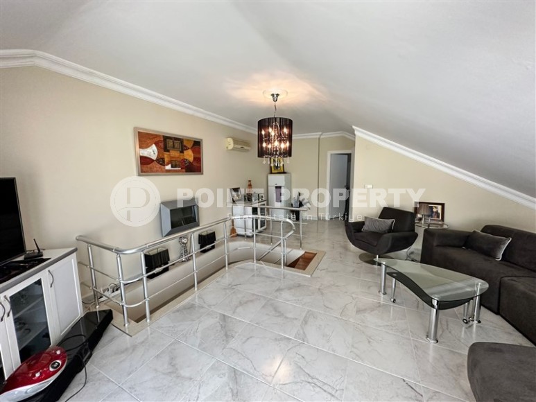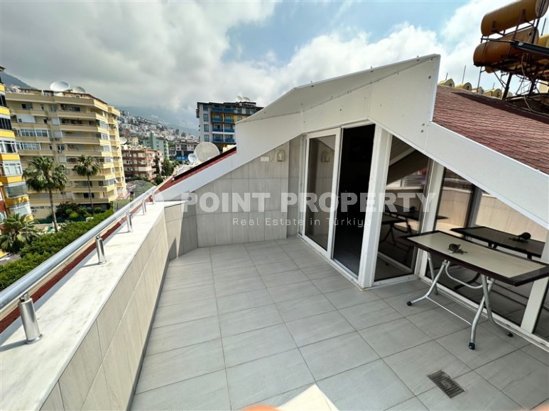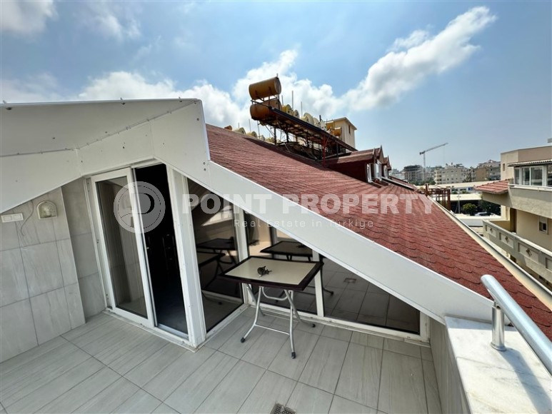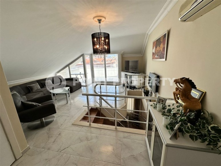Point Property's portfolio has been expanded with a comfortable, ready-to-move-in apartment, which is perfect for those looking for affordable apartments in the center of Alanya, within walking distance of the sea. A two-level apartment 2+1, with a total area of 120 m2, is located on the 4th floor with an attic, in a house built in 2003. On the 1st floor of the duplex there is a living room and bedroom combined with a kitchen, on the 2nd there is a spacious sitting area with a sitting area, another bedroom, and a spacious open roof terrace. In addition, the apartment has two bathrooms equipped with showers, and two glazed balconies overlooking the city and mountains. The design of the apartment is calm and laconic, with a combination of warm light shades and wood in the interior, which creates a feeling of home comfort. The living room is equipped with a soft sofa, coffee table, side table and dining table, the compact snow-white kitchen is equipped with a refrigerator and dishwasher. The bedrooms are equipped with comfortable beds, wardrobes, cabinets and dressing tables, and on one of the balconies there is a relaxation area with practical garden furniture. The new owners will only have to equip a recreational area on the terrace, install sun loungers and sun umbrellas, soft sofas or stylish hanging chairs.