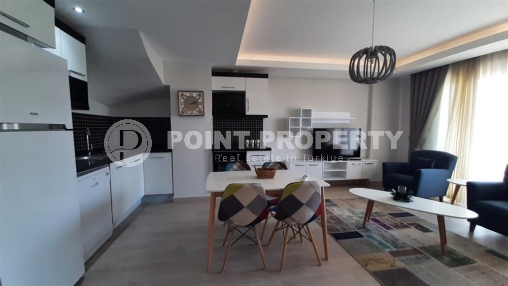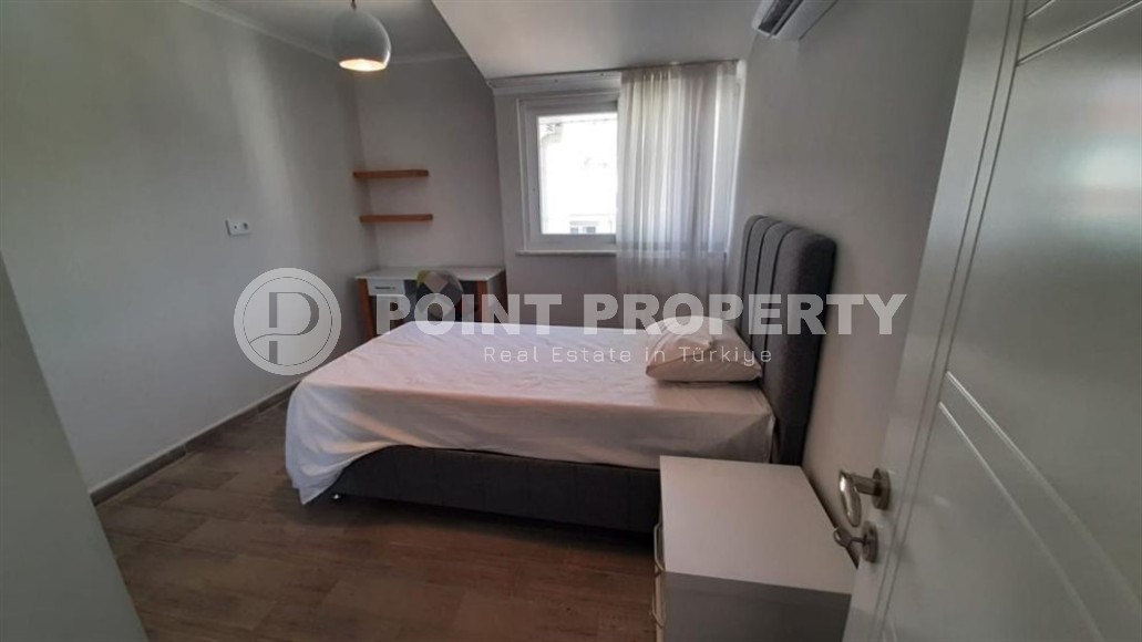 This section presents a large two-level apartment with an excellent location within walking distance from the sea and the center of the prestigious, quiet area of Alanya - Kestel. It is located on the 5th floor with an attic in a comfortable residential complex built in 2015. The layout of the 3+1 apartment, with a total area of 150 m2, consists of a living room combined with a kitchen, three bedrooms, two bathrooms equipped with showers, two open balconies and a panoramic terrace overlooking the courtyard of the residence and green mountain peaks. The apartment is bright and modern, with a laconic design, comfortable furniture and all necessary household appliances. The living room is located on the 1st floor and is equipped with soft armchairs, a sofa, coffee tables, a suite and a dining table. The practical kitchen corner is equipped with a refrigerator, dishwasher, touch surface and oven. The spacious bedrooms have comfortable beds, bedside tables, a chest of drawers, wardrobes and a desk, and on the 2nd floor there is a small laundry room with a compact closet and a washing machine.