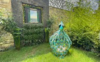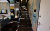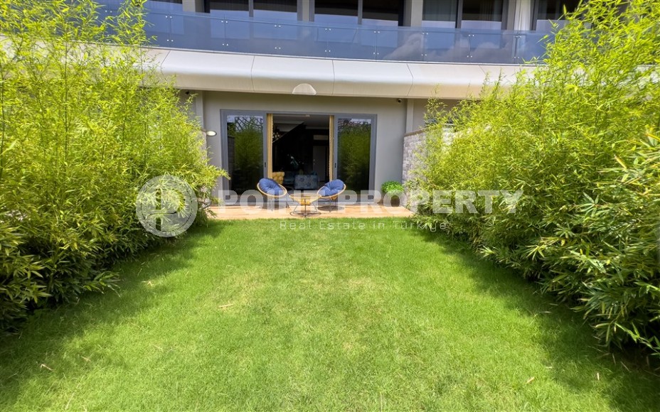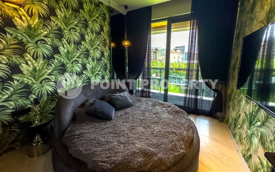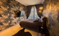 We present to your attention a conceptual apartment with an original thematic design, which is sure to make a pleasant impression on you. Spacious, with a total area of 122 m2, it is located on the 1st and 2nd floors, and has its own patio with a green lawn. On the 1st floor of the duplex there is a living room combined with a kitchen, on the 2nd there are two bedrooms, in addition, the apartment has two bathrooms equipped with a shower and a stylish black bathtub, and a balcony from where there is access from both bedrooms. The stylish living room, with original wallpaper on the walls and an exclusive chandelier, is equipped with a comfortable corner sofa and a round table with fashionable upholstered chairs. The functional, compact kitchen is equipped with the latest technology. The bedrooms are decorated in a rainforest theme, with large beds and fashionable nightstands in both rooms. The undeniable advantage of this apartment is the presence of its own garden, with a neat green lawn, where a luxurious recreational space is organized, with soft garden chairs and a stylish table. If desired, you can install sun loungers, a portable pool, or equip a children's play area here.