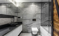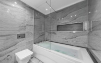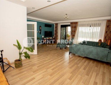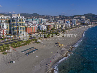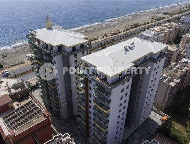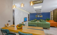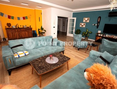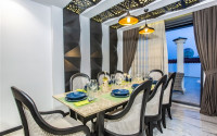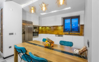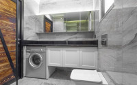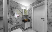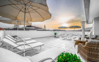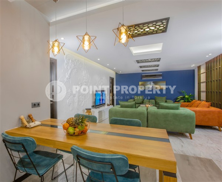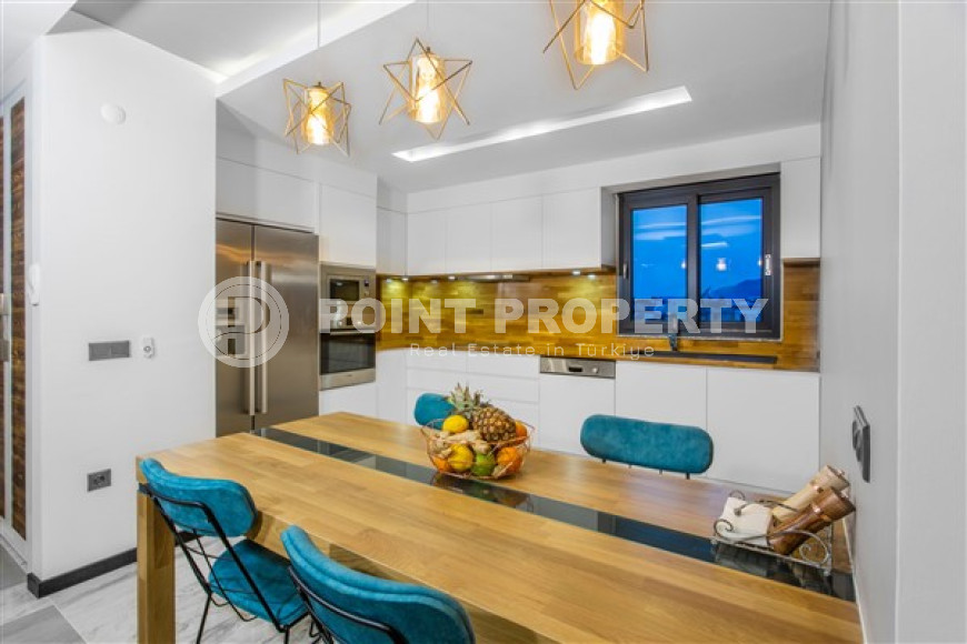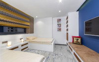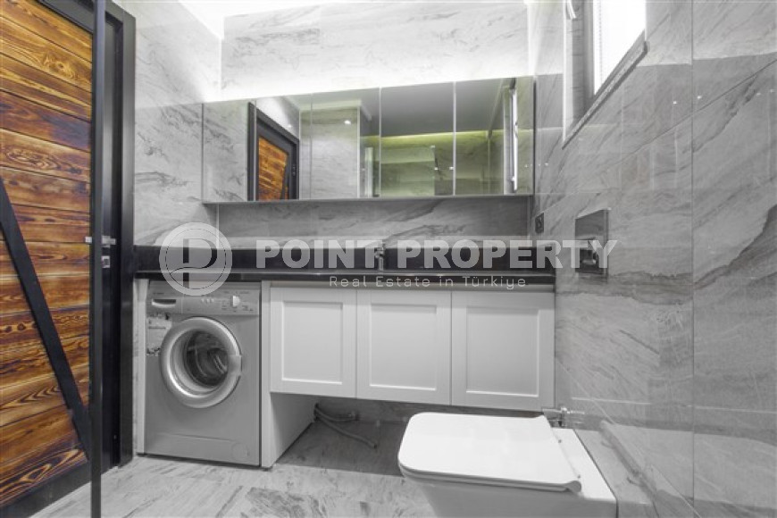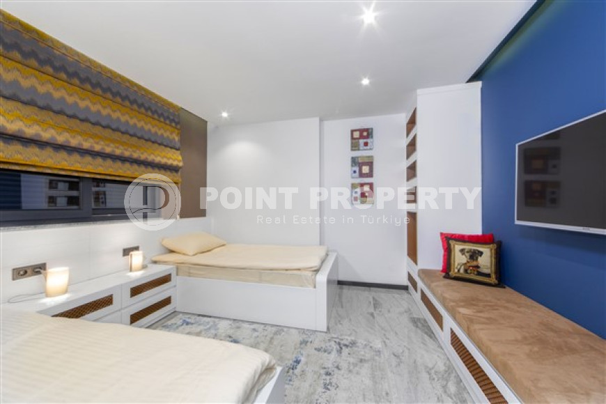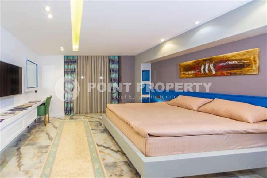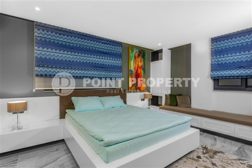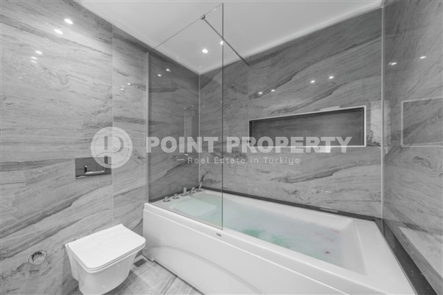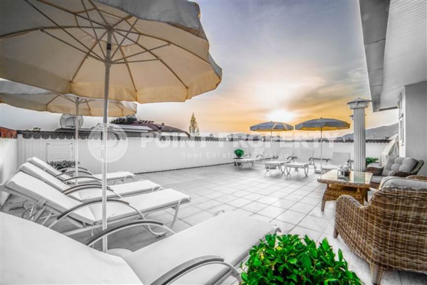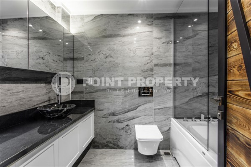 The spacious studio is furnished as a comfortable bedroom with a small kitchen in the entrance area, opposite which there is a bathroom. The penthouse has a 4+1 layout, which includes a spacious living room combined with an American-style kitchen, and four bedrooms. The lower floor of the apartment has two balconies. The apartments have three comfortable bathrooms with high-quality plumbing, and two of them have good-sized showers, and the third has showers. bath. The bedrooms are furnished in the same laconic style. The living room has high-quality new furniture. The corner kitchen has a stylish suite with a full set of household appliances. A dining group for a large family is located at the exit to the stunning terrace. There is a cozy seating area where you can comfortably spend time with family or friends, admiring the stunning views of the Mediterranean Sea, the Alanya Fortress, incredibly beautiful illuminated in the evening, and extraordinary sunsets, different every day, but always beautiful.