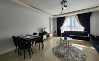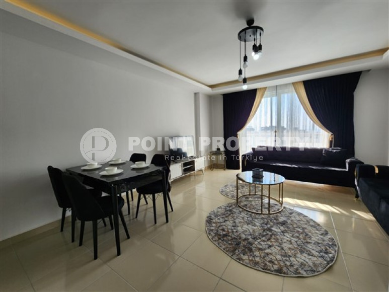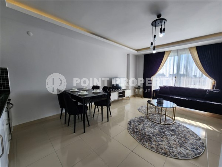 The apartment has one bedroom, a living room with an American-style kitchen, a bathroom and a balcony. The apartment is renovated and furnished, the furniture in Turkish style is chosen to contrast with the decoration. There are ceramic tiles on the floors in the rooms.