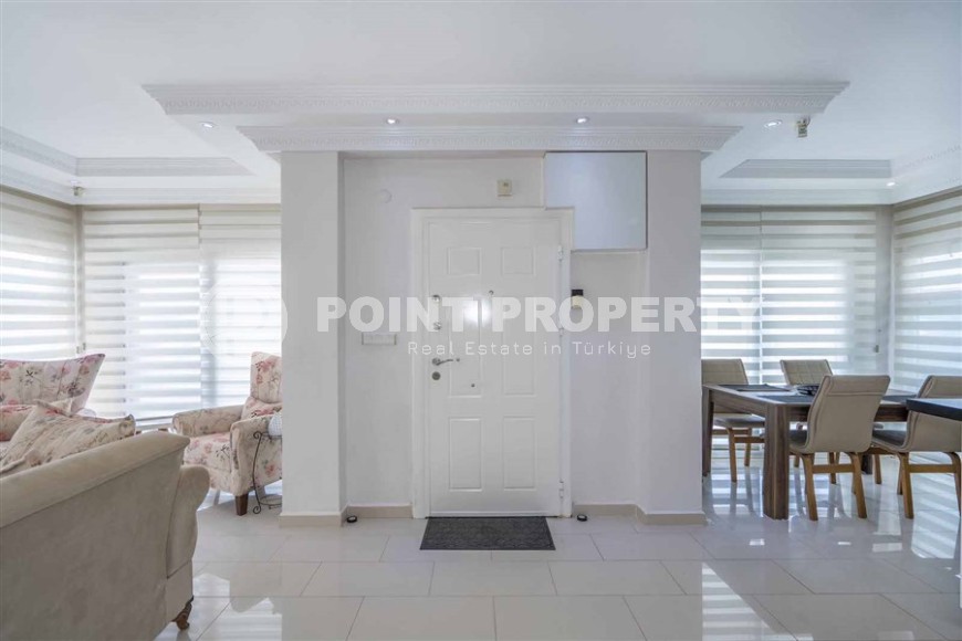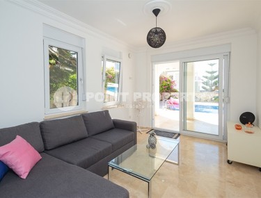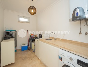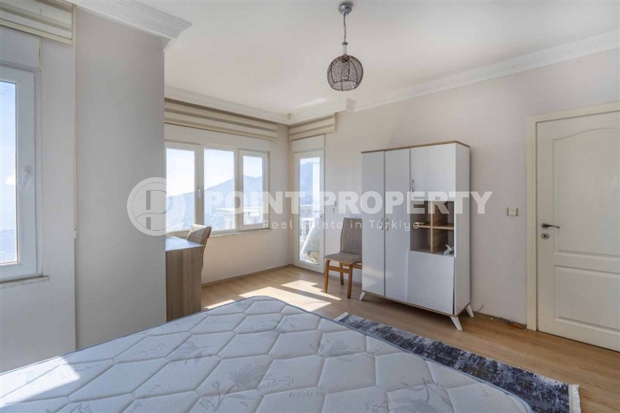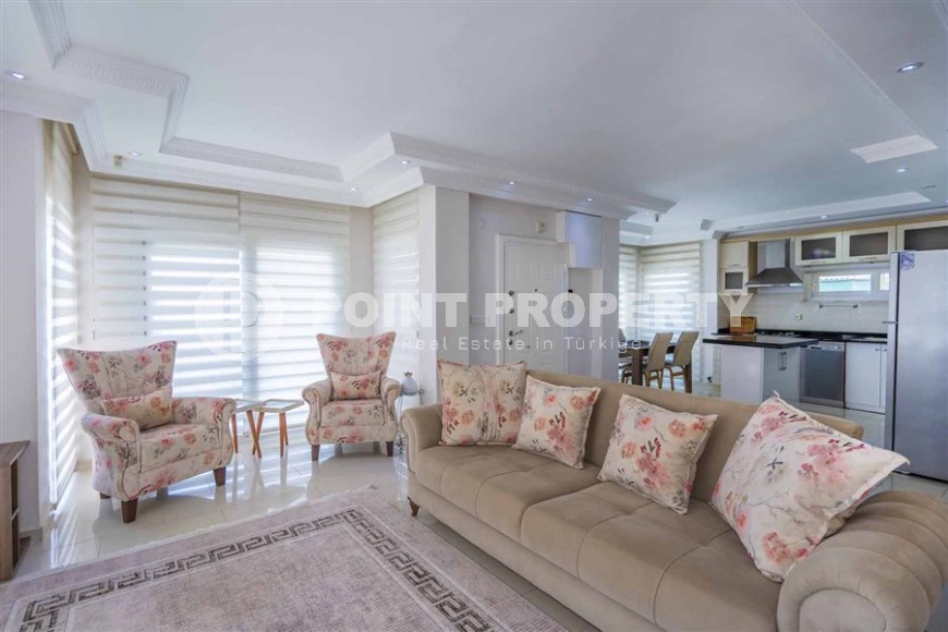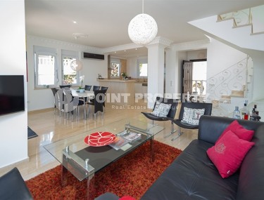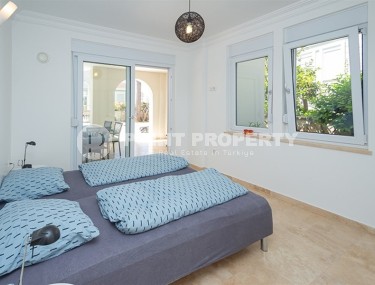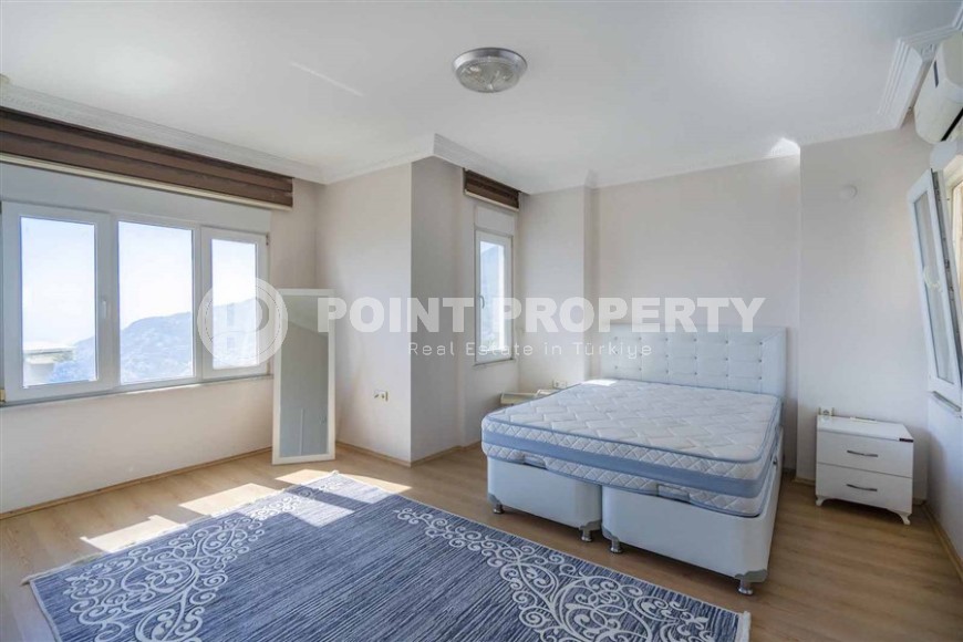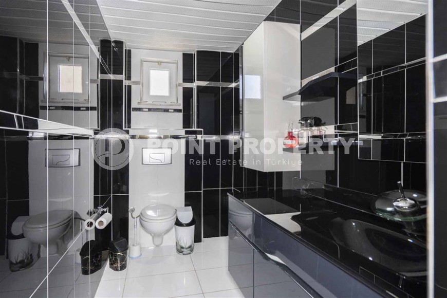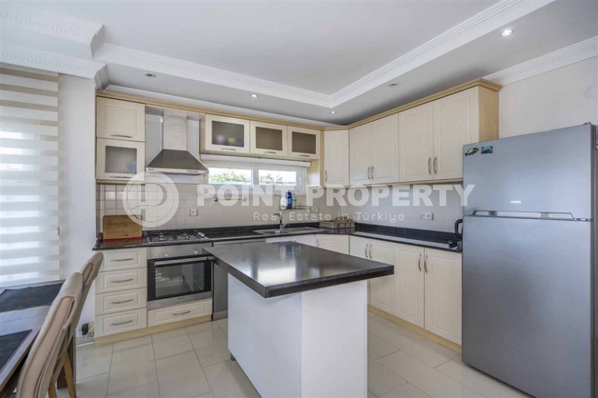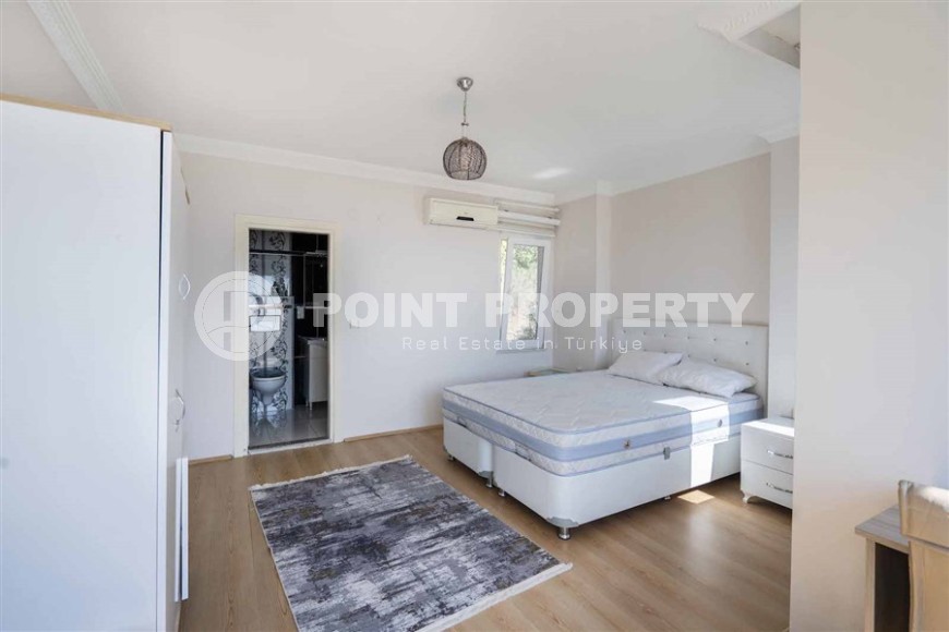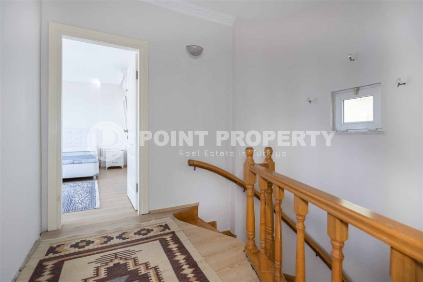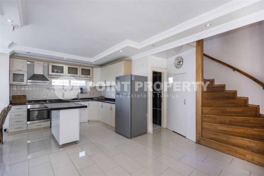 In this section we present to your attention a spacious two-storey villa with a garden and a large outdoor terrace, in the elite area of Alanya - Bektash. This part of the city is a corner of virgin nature that has preserved its natural beauty. Located just a few minutes' drive from the bustling tourist center, this area is distinguished by a calm, easy atmosphere, picturesque mountain landscapes, excellent ecology and magnificent panoramic views of the sea and the Alanya fortress. The proposed villa also has excellent views; it consists of an open American kitchen, a living room, two bedrooms, three bathrooms, and two panoramic balconies overlooking the sea and Mount Calais. The total area of the villa is 150 m2. The design of the rooms is simple and laconic, with a combination of warm light colors in the interior, which creates a feeling of space and cleanliness. The living room is successfully divided into a dining area, with a massive wooden table, and a living room, with comfortable soft sofas and a coffee table. The classic, functional kitchen corner is equipped with a refrigerator, dishwasher and oven. The spacious bedrooms are equipped with large comfortable beds, bedside tables and wardrobes, and in one of the rooms there is a compact work area with a desk. The spacious outdoor terrace is equipped with a recreational sunbathing area with sun loungers, where new owners will be able to install swings, stylish hanging chairs or soft sofas. The villa was built in 2008, and is located just two and a half kilometers from the center of Alanya, where, along with the usual supermarkets, pharmacies, cafes, bank branches and communications, there are fashion boutiques, restaurants for every taste, bars, nightclubs, private and state clinics, children's educational institutions. The luxurious sandy beaches for which the city center is famous, and the picturesque promenade, with bicycle paths, children's and sports grounds, gazebos and comfortable recreation areas, are located three kilometers from the villa.