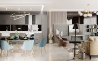 According to the project, the villas have a 4+1 layout. On the ground floor: a spacious living room combined with a kitchen, a bathroom and a terrace. On the second floor: 2 large bedrooms with private bathrooms. On the third, another bedroom with a bathroom, another living room combined with a kitchen and a balcony.