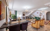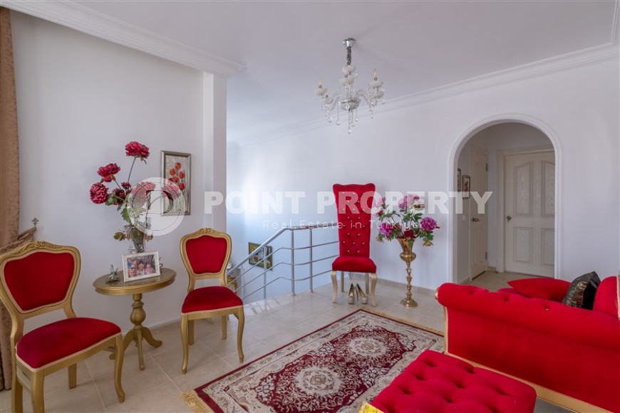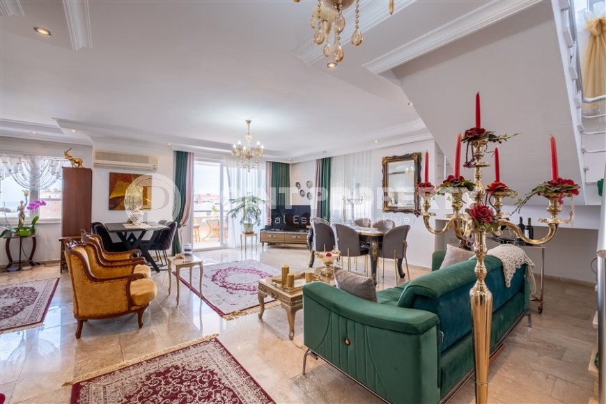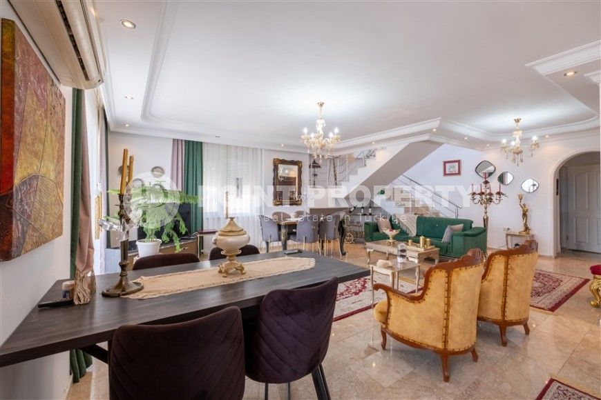 Планируете переехать всей семьей в солнечную Аланью? Рады сообщить, что в центре популярного района города - Махмутлар выставлена на продажу большая двухуровневая квартира 3+1, расположенная на 10-м этаже с мансардой в жилом комплексе 2007 года постройки. В планировке дуплекса, общей площадью 270 м2, - американская кухня, совмещенная с гостиной, три спальни, сауна, три санузла, один из которых оснащен джакузи, два балкона и просторная открытая терраса с панорамным видом на город. Дизайн апартаментов выполнен в классическом стиле, с массивными люстрами, элементами золота, оригинальной мебелью и предметами декора. Гостиная визуально разделена на несколько функциональных зон и укомплектована мягкими креслами, диваном, столами, тумбами, сервантом и журнальным столиком. Белоснежная современная кухня оснащена холодильником, стиральной и посудомоечной машинами, газовой плитой и духовым шкафом. В спальнях установлены комфортабельные кровати, тумбы и вся необходимая мебель, а в гостиной на 2-м этаже организована дополнительная комната отдыха. На балконах и террасе также оборудованы полноценные рекреационные пространства.
