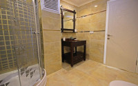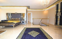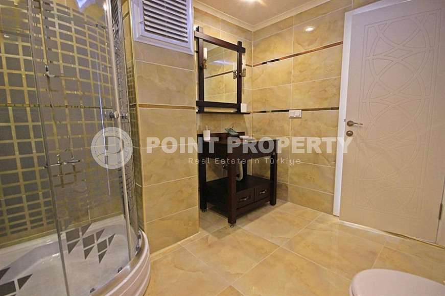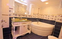 Дуплекс-пентхаус, планировки 3+1 и общей площадью 220м² имеет на нижнем этаже просторную гостиную, совмещённую с кухонной зоной с вместительным гарнитуром и бытовой техникой. Кухня аркой немного отделена от зоны отдыха, в которой установлена качественная мягкая мебель, телевизор. Камин располагает к неторопливым уютным вечерам. Обеденная зона позволит собраться членам большой семьи за одним столом. Из гостиной можно выйти на большой угловой балкон, который ориентирован на север и запад и имеет превосходный открытый вид на Средиземное море, крепость Алании и горы Торос. Одна из трех спален тоже находится на нижнем этаже. Две просторные спальни расположены на верхнем этаже пентхауса. Апартаменты располагают двумя укомплектованными ванными комнатами (по одной на каждом этаже), причем в одной из них установлена душевая кабина, а во второй - джакузи. Спальня нижнего этажа дуплекса имеет свой балкон, ориентированный на север. В большой прихожей находится удобная широкая лестница, ведущая на второй этаж пентхауса. Под лестницей есть просторная кладовая, что порадует новых собственников. Спальни второго этажа имеют выход на огромную террасу с потрясающим панорамным видом.