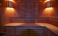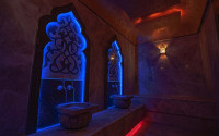 На пляже напротив комплекса в плитах вырублен песчаный вход в воду. Там же находится центр водных развлечений. Попасть на пляж можно по подземному переходу, которые организованы на всём протяжении дороги, для безопасности пешеходов.