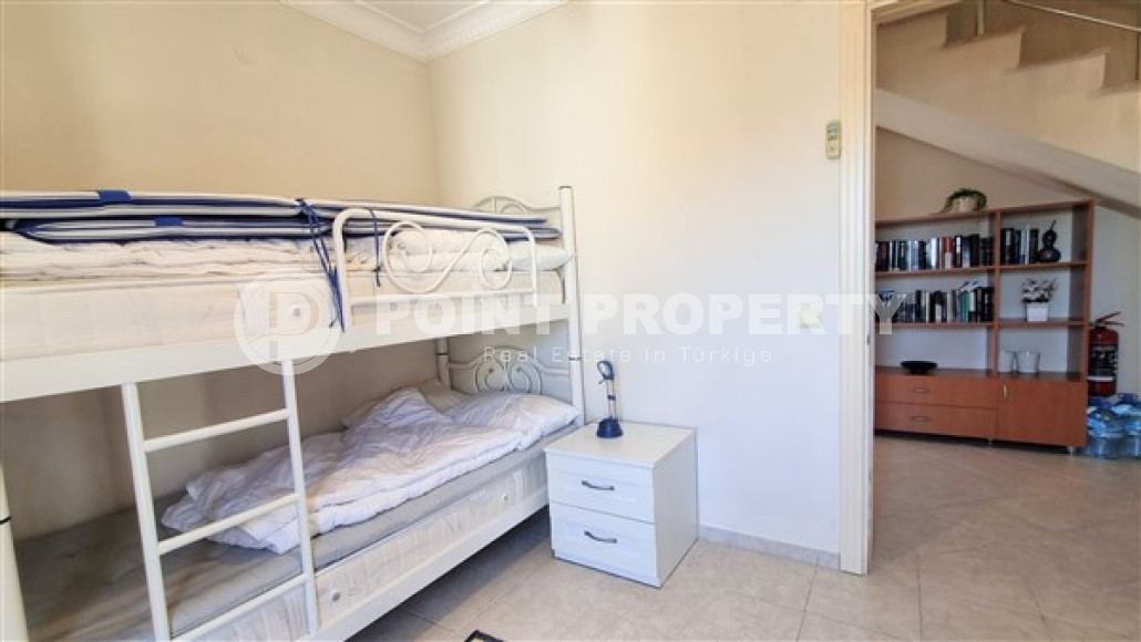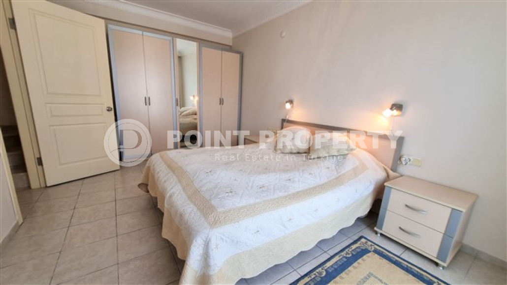 Предлагаем вашему вниманию отличное предложение от собственника: просторный дуплекс-пентхаус, планировки 3+1 в комплексе 2006 года постройки в районе Алании – Оба. На 5-6 этаже, на 160м² разместилась: большая гостиная, объединенная с компактной кухней, 3 меблированные спальни, 2 полностью оборудованные ванные комнаты (по одной на этаже). В гостиной, у панорамного окна, установлена элегантная мягкая мебель. Кухонная зона укомплектована гарнитуром с островом и комплектом бытовой техники. Две спальни расположены на нижнем этаже, а третья – на верхнем. Нижний этаж пентхауса располагает двумя балконами, а верхний – просторной террасой. Квартира имеет просторную прихожую с гранитной лестницей, соединяющей этажи. В квартире поработал дизайнер, выполнен качественный ремонт, она продается с полным комплектом мебели и бытовой техники, как показано на фото.