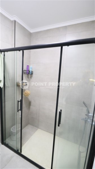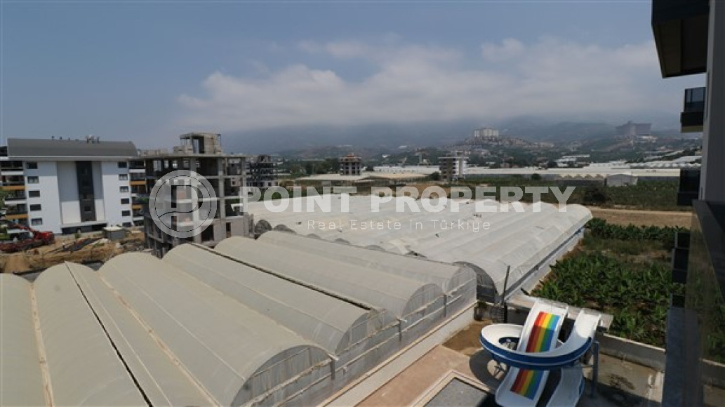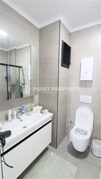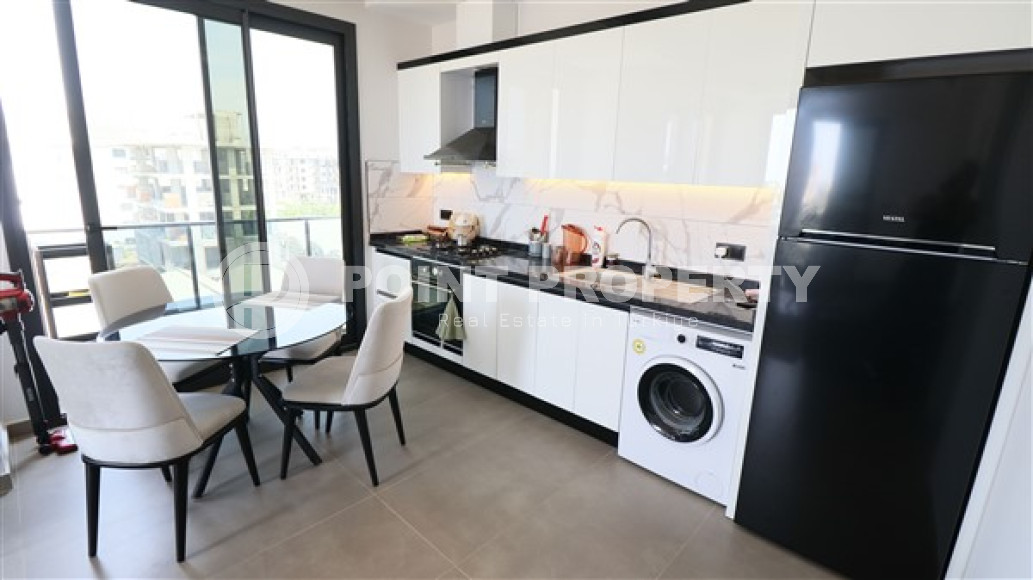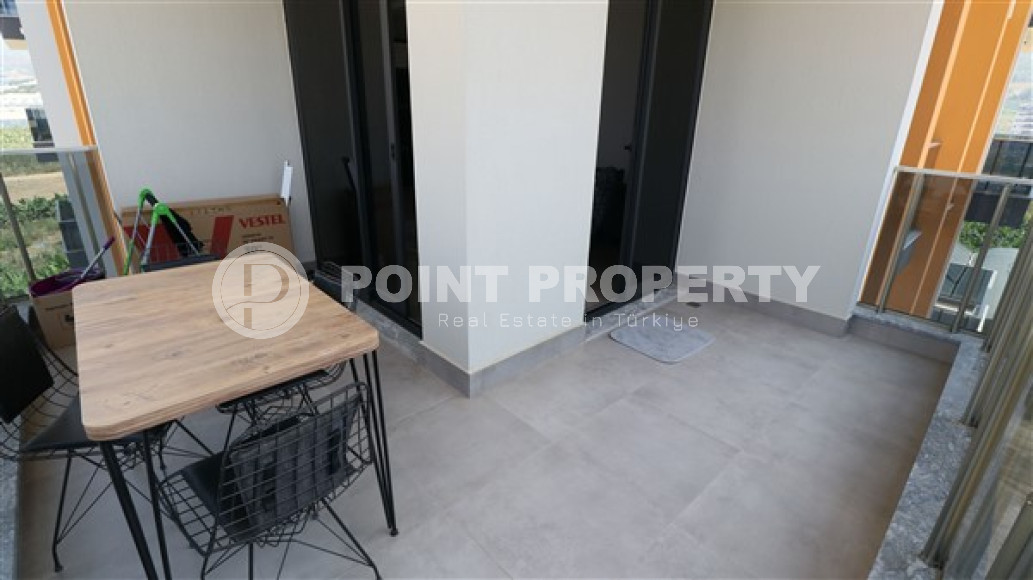 Планировкой квартиры предусмотрено наличие просторной гостиной, совмещенной с кухней открытого типа, одной спальни, ванной комнаты, прихожей и одного балкона. В салоне установлена симпатичная мягкая мебель, телевизор. Кухонный гарнитур имеет гранитную рабочую поверхность, достаточное количество шкафов и укомплектован бытовой техникой. Спальня меблирована, ванная комната укомплектована качественной сантехникой. На балконе установлена садовая мебель и можно любоваться прекрасными горами Торос и Средиземным морем. Квартира продается с полной чистовой отделкой, мебелью и бытовой техникой, представленной на фото.