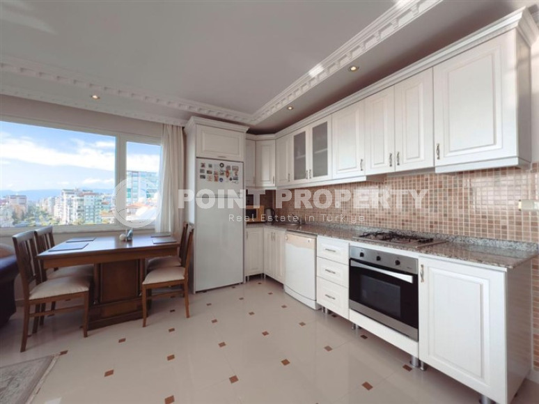 Квартира, планировки 2+1 и общей площадью 110м² имеет просторную гостиную, совмещённую с кухонной зоной. В зоне отдыха качественная мягкая мебель, симпатичная обеденная зона на 4 персоны. Кухонная зона – с большим количеством мест для хранения утвари, гранитной столешницей с просторной рабочей зоной. Спальные комнаты обставлены всей необходимой мебелью. В квартире большая прихожая, которую почти невозможно встретить в более современных постройках. Две просторные ванные комнаты полностью укомплектованы качественной мебелью и сантехникой. Квартира ориентирована на юг, запад и север, что, помимо превосходных видов, обеспечит прекрасную проветриваемость в жаркие месяцы. Апартаменты располагают двумя большими балконами, которые, при желании, можно остеклить, которые дарят прекрасные виды на Средиземное море, Аланийскую крепость и горы Торос.