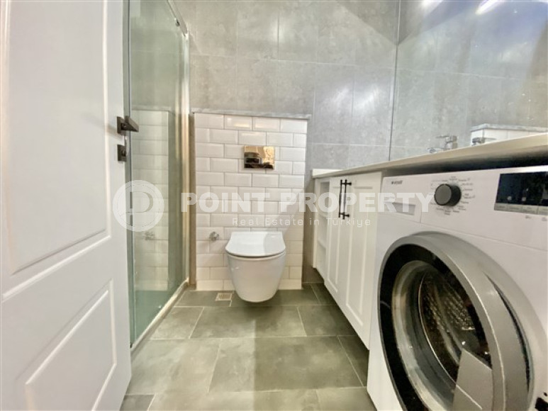 Разрешите предложить вам на рассмотрение отличный вариант покупки квартиры с планировкой 1+1 и площадью 40 м2, которая уже сейчас полностью готова к проживанию либо аренде с целью получения прибыли. Двухкомнатная квартира состоит их гостиной с кухней, а также спальной комнаты с дополнительным обзорным балконом, расположенным на третьем этаже комплекса 2022 года постройки. Как вы видите на представленных фотографиях, жилое помещение оборудовано мебелью в классическом стиле, которая уже входит в полную стоимость, указанную на нашем сайте в соответствующей графе. Отдельно хочется выделить удобный угловой кухонный гарнитур с бытовой техникой и барным столиком. Стиральная машинка удачно размещена в ванной комнате.
