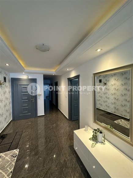 Портфолио компании Point Property пополнила просторная, готовая к проживанию квартира, расположенная на 4-м этаже в жилом комплексе, построенном в 2007 году, на самом берегу моря, в центре популярного района Аланьи - Махмутлар. Общая площадь апартаментов - 165 м2, в планировке - кухня открытого типа, просторная гостиная, три спальни, два оснащенных душевыми кабинами санузла, и два открытых балкона, с видом на море и внутренний двор резиденции. Квартира - светлая и современная, с комфортабельной мебелью и всей необходимой бытовой техникой. Гостиная удачно разделена на две функциональные зоны - салон, с мягким угловым диваном, журнальным столиком и пуфом; и кухню, со стильным обеденным столом и большой рабочей поверхностью, оснащенной холодильником, посудомоечной машиной и духовым шкафом. В спальнях установлены удобные кровати, тумбы и трюмо, а при входе имеется вместительный комод.