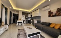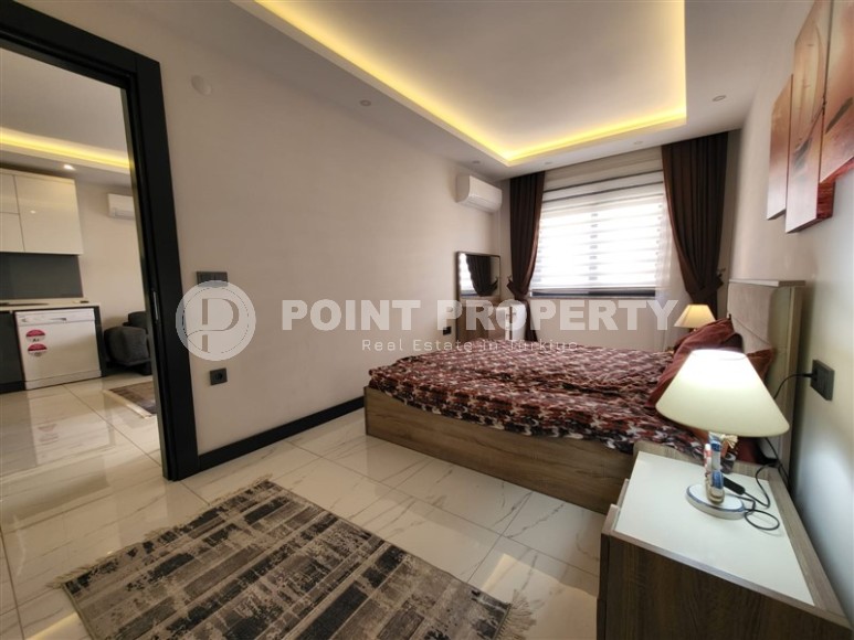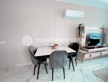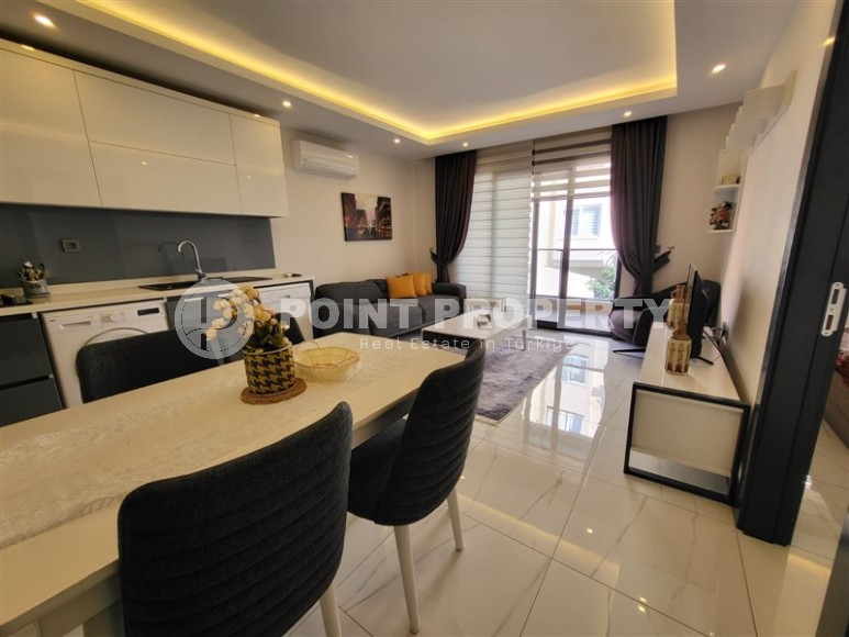 В данном разделе вашему вниманию представлена небольшая квартира с качественным ремонтом, современным дизайном, комфортабельной мебелью и всей необходимой бытовой техникой. Учитывая ее лояльную стоимость и расположенность в пешей доступности от моря и центра Аланьи, она может использоваться как для собственного проживания, так и для успешной сдачи в аренду. Компактная, общей площадью 55 м2, она расположена на 1-м этаже в резиденции 2020 года постройки, и имеет в планировке совмещенную с кухней гостиную, спальню, оснащенный душевой кабиной санузел и открытый балкон, с видом на внутренний двор комплекса. Квартира - светлая и комфортабельная, в основе интерьера - белый цвет, который удачно дополняют современные картины, со вкусом подобранные предметы декора и мягкое точечное освещение. Гостиная укомплектована мягким диваном, журнальным столиком, тумбой и обеденным столом. Практичная черно-белая кухня оснащена холодильником, стиральной и посудомоечной машинами и духовым шкафом, а в просторной спальне установлены большая кровать, тумбы и трюмо.