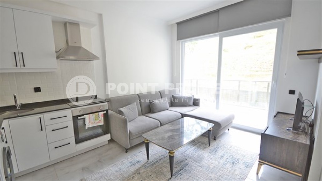 Именно здесь, в новой резиденции, построенной в прошлом году, расположена квартира, которую после покупки вы можете как оставить в личном пользовании, так и сдавать в аренду. Двухкомнатные апартаменты с оптимальной планировкой 1+1 дополнительно оснащены открытым балконом, который впоследствии можно остеклить, чтобы добавить дополнительную жилую площадь. Квартира находится на первом этаже резиденции и полностью укомплектована мебелью: угловым гарнитуром с холодильником и стиральной машиной в зоне кухни, диваном, столиком и телевизором в зоне отдыха, а также отдельной кроватью и деревянным шкафом в спальне. Качественная сантехника и душевая кабина оснащают ванную комнату.
