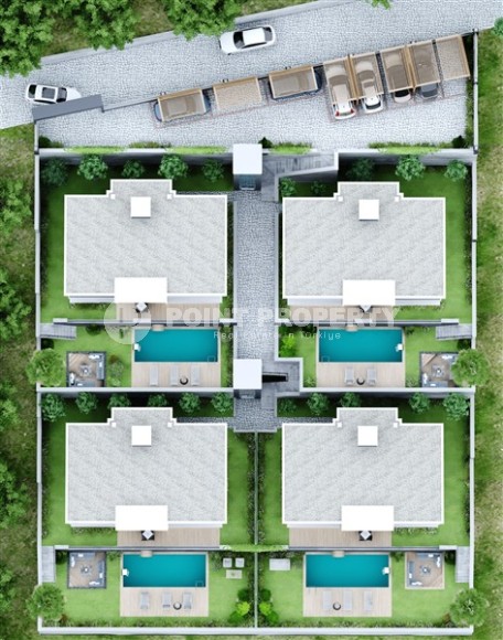 Каждый дом находится на участке 450 м2, с бассейном, садом и беседкой для отдыха. У въезда на территорию оборудован крытый паркинг.