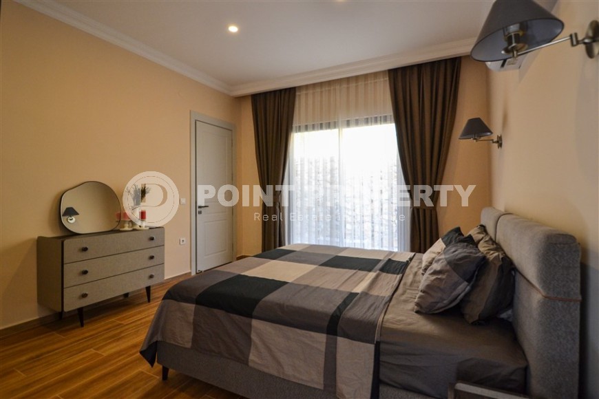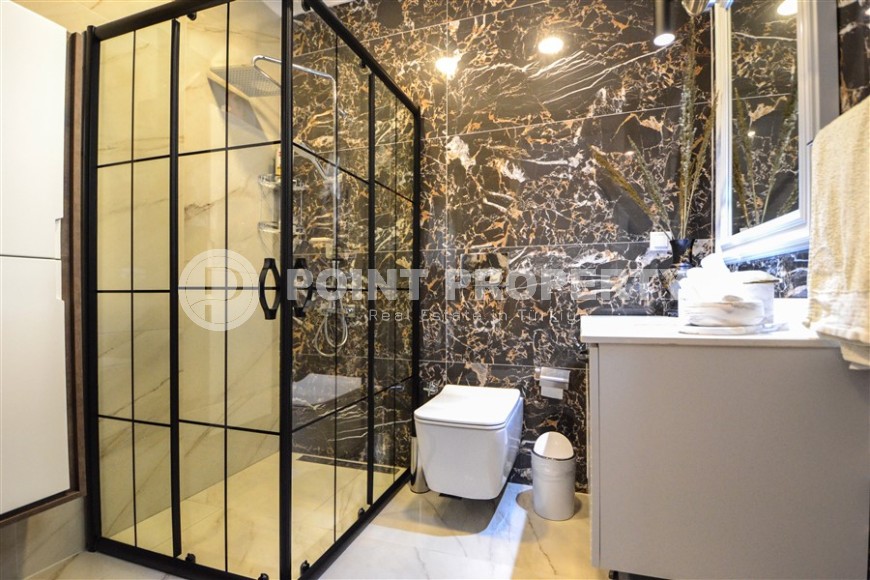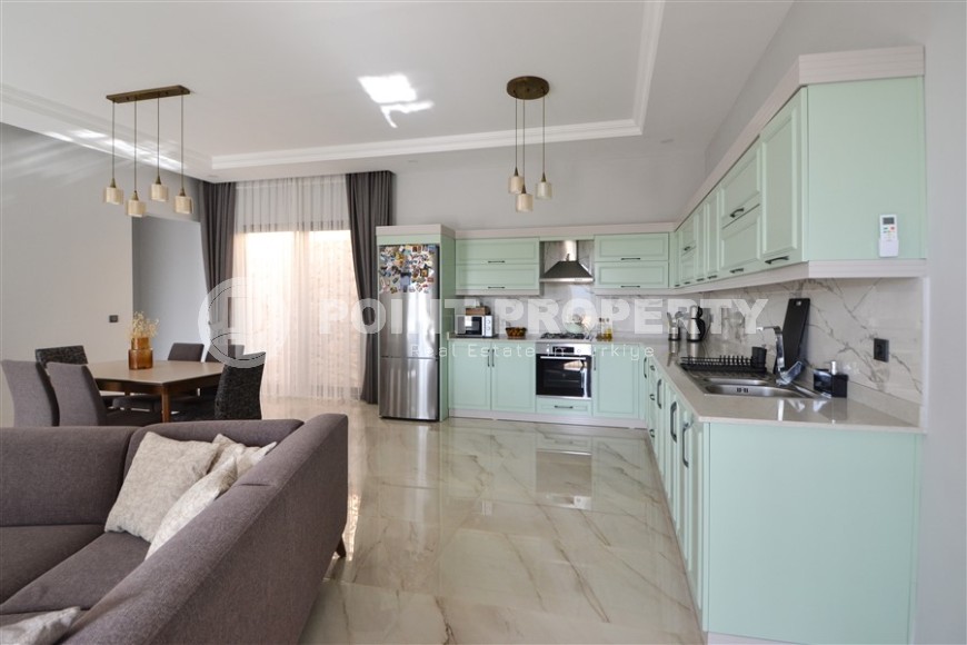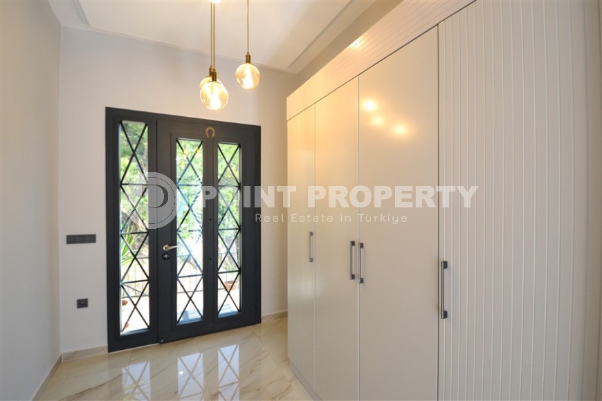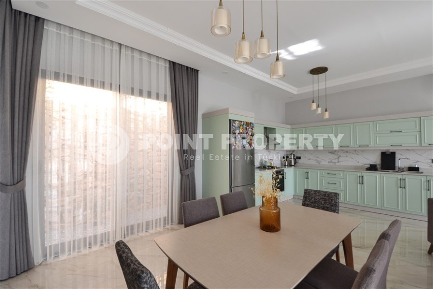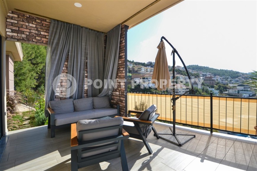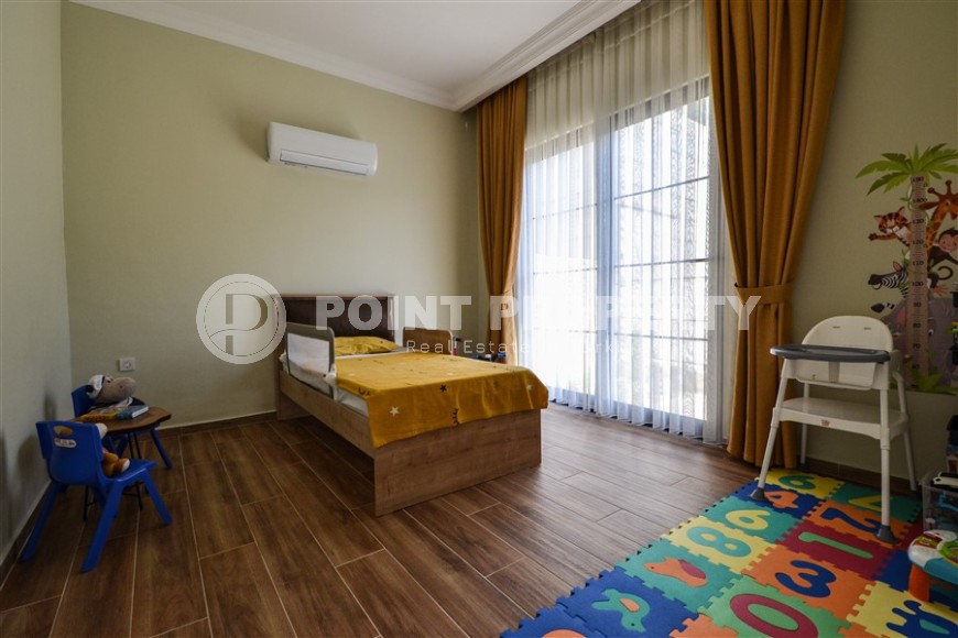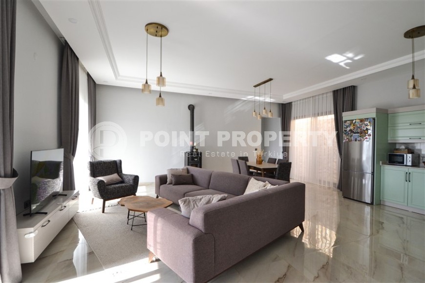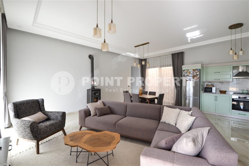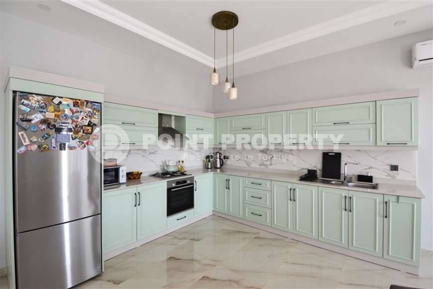 Мечтаете о загородном доме, в зеленой, экологически чистой местности? В портфолио лицензированного агентства недвижимости Point Property как раз появился отличный вариант - одноэтажная вилла с небольшим гостевым домом, в спокойном, живописном районе Аланьи - Каргыджак. Эта часть курорта расположена у подножья Торосских гор, и славится красивейшими ландшафтами, хвойными лесами и уютной, легкой атмосферой. Дом был построен в 2018 году на просторном участке, площадью 815 м2, и имеет в планировке кухню открытого типа, совмещенную с салоном, три спальни, два оснащенных стильными душевыми кабинами санузла и большой открытый балкон. Общая площадь виллы - 150 м2. Дом полностью укомплектован современной мебелью и бытовой техникой, и готов к проживанию. В центре гостиной установлены: комфортабельный угловой диван, кресло, оригинальные журнальные столики, тумба и обеденный стол. Просторная кухня - мечта любой хозяйки - оснащена холодильником, духовым шкафом и газовой плитой. Спальни укомплектованы мягкими кроватями, тумбами и комодом, при входе имеется вместительный гардеробный шкаф, а на открытой террасе, с панорамным видом на город и море вдалеке, организована стильная зона отдыха, с удобными садовыми креслами и диваном. Гостевой дом, общей площадью 40 м2, состоит из совмещенной с кухней комнаты и санузла, и также полностью меблирован.