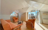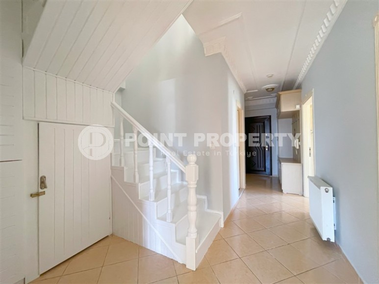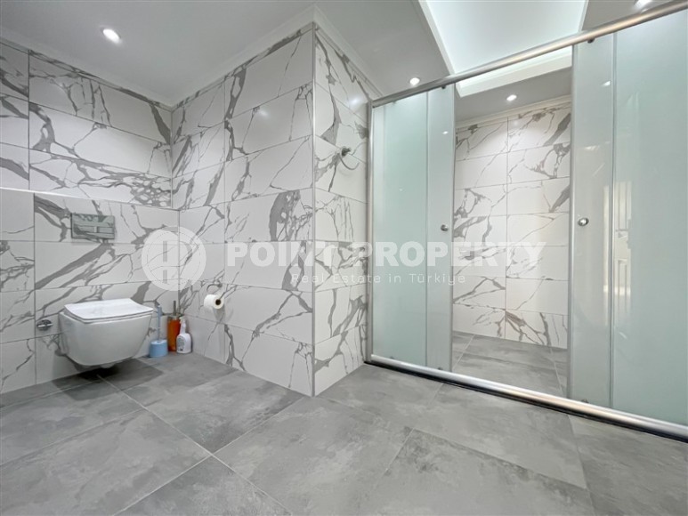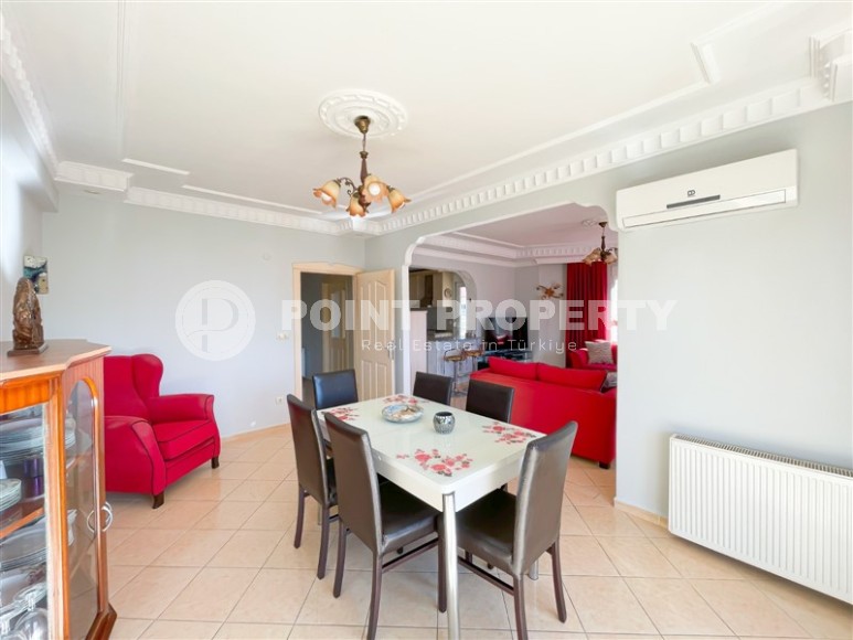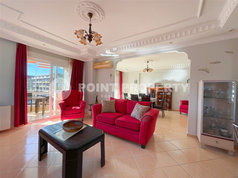 Мечтаете переехать всей семьей к морю или присматриваете летнюю резиденцию для проведения отпусков на побережье Турецкой Ривьеры? В портфолио компании Point Property как раз появился отличный вариант - просторная двухуровневая квартира 3+1, общей площадью 180 м2, на 5-м этаже с мансардой в самом центре района Нижняя Оба. Эта часть курорта идеально подходит для жизни круглый год - благоустроенные парковые зоны, яркие детские и спортивные площадки, симпатичные ухоженные улочки, уютные внутренние дворики - все это напоминает комфортабельный европейский городок. Предлагаемая квартира имеет в планировке кухню, просторную гостиную, три спальни, два санузла, один из которых оснащен душевой кабиной, два балкона и панорамную открытую террасу с видом на море. Апартаменты полностью укомплектованы всем необходимым для комфортного проживания. Гостиная, с изящной лепниной на потолках, ярко-красной мягкой мебелью и подобранными в тон шторами, отделена от кухни широкой аркой и имеет два функциональных пространства - салон, с мягкими диванами, креслом, тумбой и журнальным столиком; и обеденную зону, с большим столом и оригинальным шкафом в старинном стиле. Компактная кухня оснащена холодильником, посудомоечной машиной, сенсорной поверхностью и духовым шкафом. В двух спальнях установлены кровати, тумбы и вместительные гардеробные шкафы, а в одной из комнат оборудована дополнительная зона отдыха, с комфортабельными креслами, диваном, журнальным столиком и встроенными шкафами. На застекленном балконе и просторной открытой террасе организованы рекреационные зоны и площадка для пикников, с практичной плетеной мебелью и каменным мангалом.
